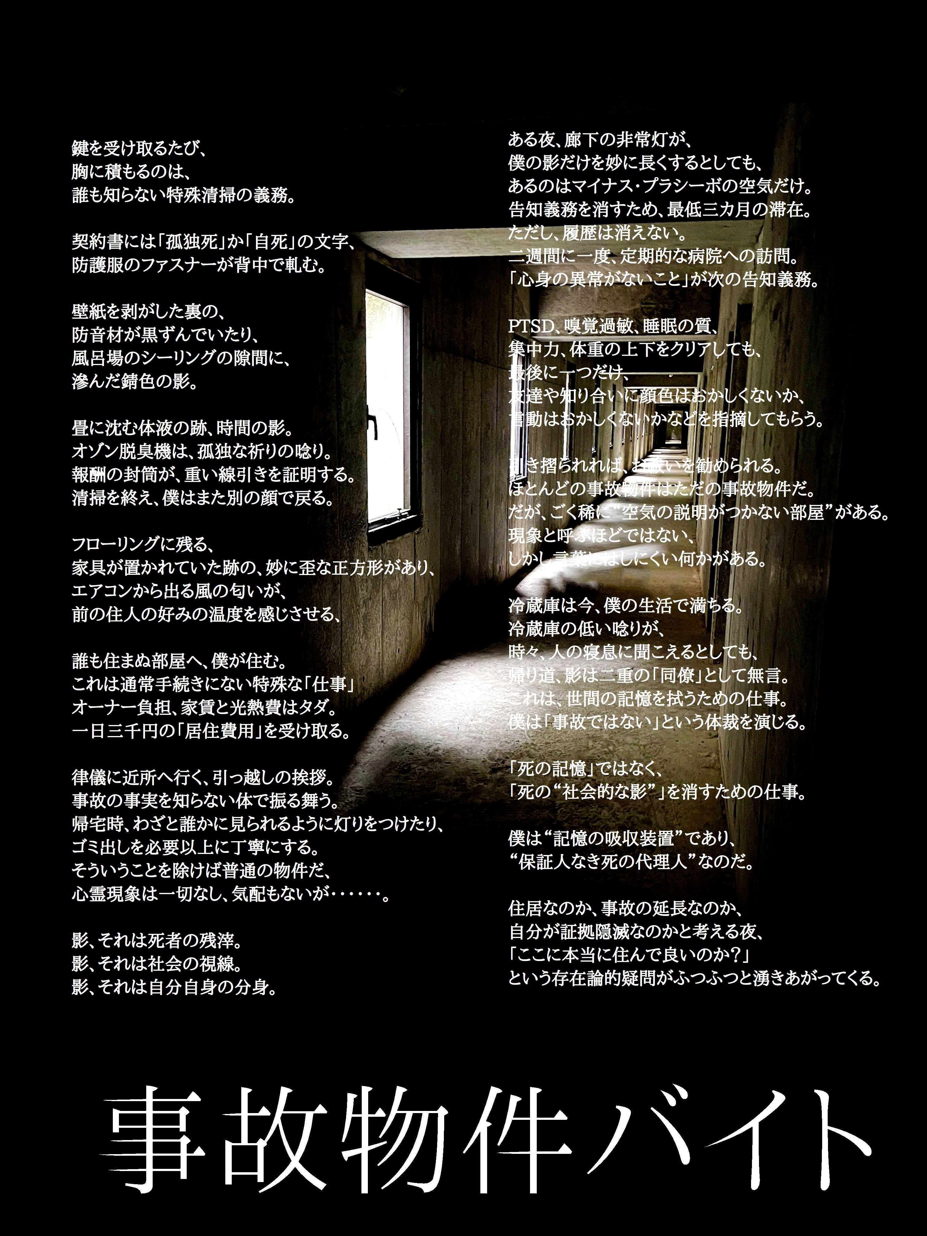 事故物件バイト鍵を受け取るたび、胸に積もるのは、誰も知らない特殊清掃の義務。契約書には「孤独死」か「自死」の文字、 防護服のファスナーが背中で軋む。壁紙を剥がした裏の、防音材が黒ずんでいたり、風呂場のシーリングの隙間に、滲んだ錆色の影。畳に沈む体液の跡、時間の影。 オゾン脱臭機は、孤独な祈りの唸り。 報酬の封筒が、重い線引きを証明する。 清掃を終え、僕はまた別の顔で戻る。フローリングに残る、家具が置かれていた跡の、妙に歪な正方形があり、エアコンから出る風の匂いが、前の住人の好みの温度を感じさせる、誰も住まぬ部屋へ、僕が住む。 これは通常手続きにない特殊な「仕事」オーナー負担、家賃と光熱費はタダ。 一日三千円の「居住費用」を受け取る。律儀に近所へ行く、引っ越しの挨拶。 事故の事実を知らない体で振る舞う。 帰宅時、わざと誰かに見られるように灯りをつけたり、ゴミ出しを必要以上に丁寧にする。そういうことを除けば普通の物件だ、心霊現象は一切なし、気配もないが・・・・・・。影、それは死者の残滓。影、それは社会の視線。影、それは自分自身の分身。ある夜、廊下の非常灯が、僕の影だけを妙に長くするとしても、あるのはマイナス・プラシーボの空気だけ。告知義務を消すため、最低三カ月の滞在。 ただし、履歴は消えない。 二週間に一度、定期的な病院への訪問。 「心身の異常がないこと」が次の告知義務。PTSD、嗅覚過敏、睡眠の質、集中力、体重の上下をクリアしても、最後に一つだけ、友達や知り合いに顔色はおかしくないか、言動はおかしくないかなどを指摘してもらう。引き摺られれば、お祓いを勧められる。ほとんどの事故物件はただの事故物件だ。だが、ごく稀に“空気の説明がつかない部屋”がある。現象と呼ぶほどではない、しかし言葉にはしにくい何かがある。冷蔵庫は今、僕の生活で満ちる。 冷蔵庫の低い唸りが、時々、人の寝息に聞こえるとしても、帰り道、影は二重の「同僚」として無言。 これは、世間の記憶を拭うための仕事。 僕は「事故ではない」という体裁を演じる。「死の記憶」ではなく、「死の“社会的な影”」を消すための仕事。僕は“記憶の吸収装置”であり、“保証人なき死の代理人”なのだ。住居なのか、事故の延長なのか、自分が証拠隠滅なのかと考える夜、「ここに本当に住んで良いのか?」という存在論的疑問がふつふつと湧きあがってくる。