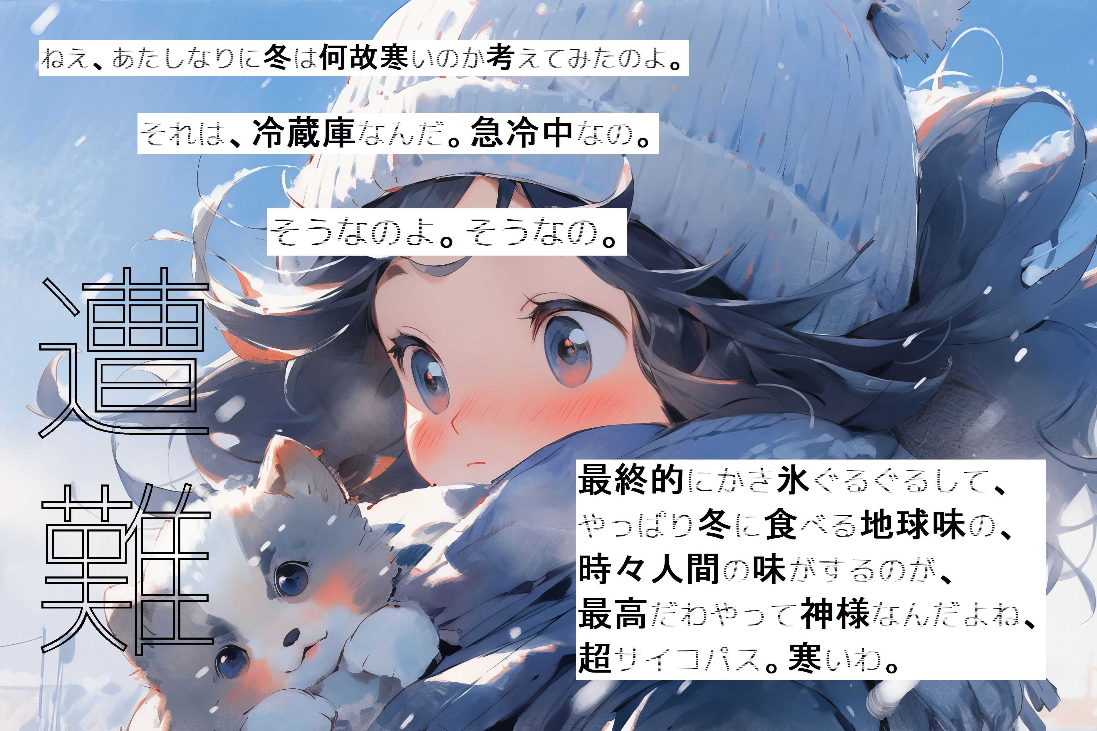 遭難ねえ、あたしなりに冬は何故寒いのか考えてみたのよ。それは、冷蔵庫なんだ。急冷中なの。そうなのよ。そうなの。最終的にかき氷ぐるぐるして、やっぱり冬に食べる地球味の、時々人間の味がするのが、最高だわやって神様なんだよね、超サイコパス。寒いわ。