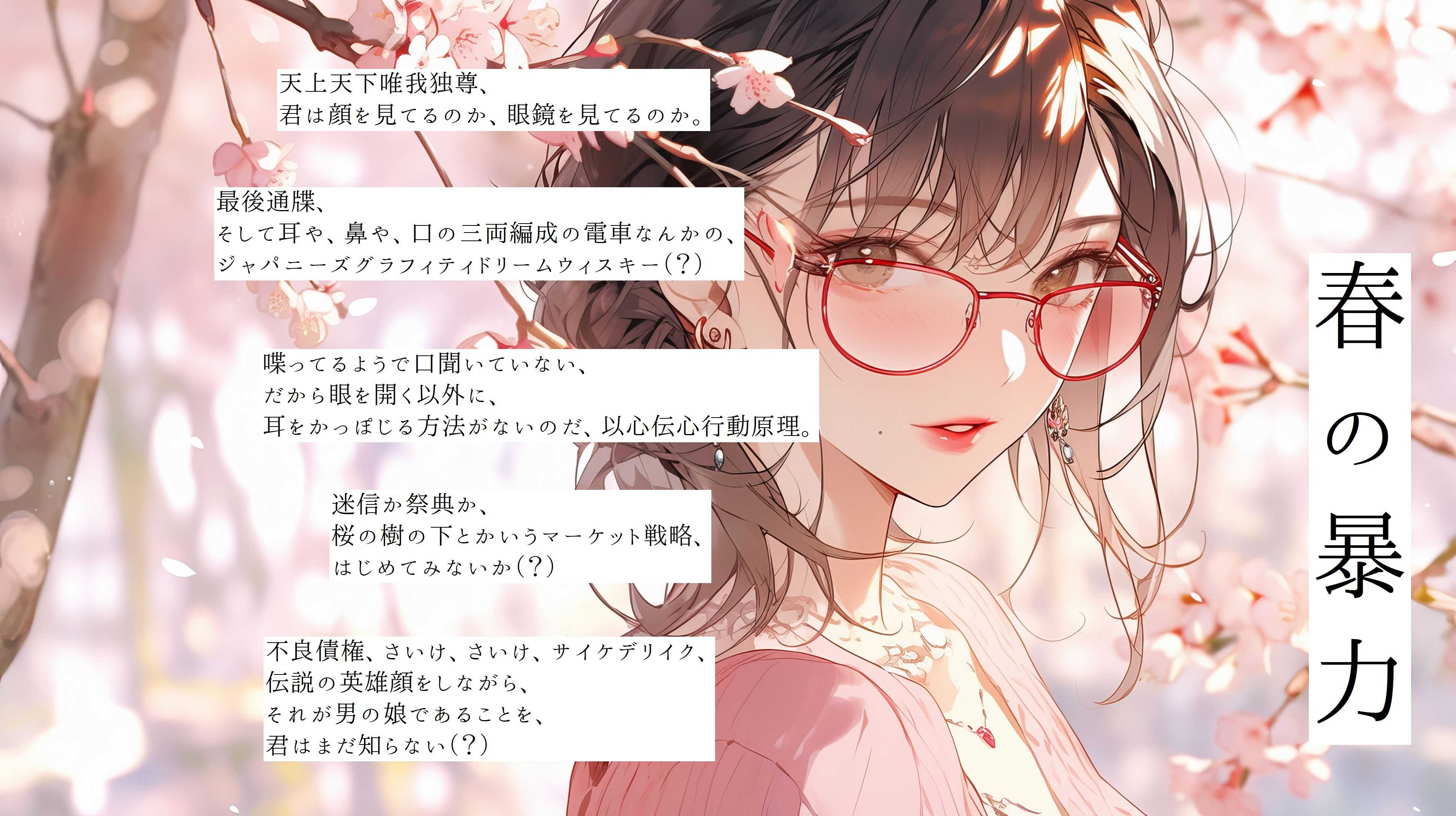 春の暴力天上天下唯我独尊、君は顔を見てるのか、眼鏡を見てるのか。最後通牒、そして耳や、鼻や、口の三両編成の電車なんかの、ジャパニーズグラフィティドリームウィスキー(?)喋ってるようで口聞いていない、だから眼を開く以外に、耳をかっぽじる方法がないのだ、以心伝心行動原理。迷信か祭典か、桜の樹の下とかいうマーケット戦略、はじめてみないか(?)不良債権、さいけ、さいけ、サイケデリイク、伝説の英雄顔をしながら、それが男の娘であることを、君はまだ知らない(?)