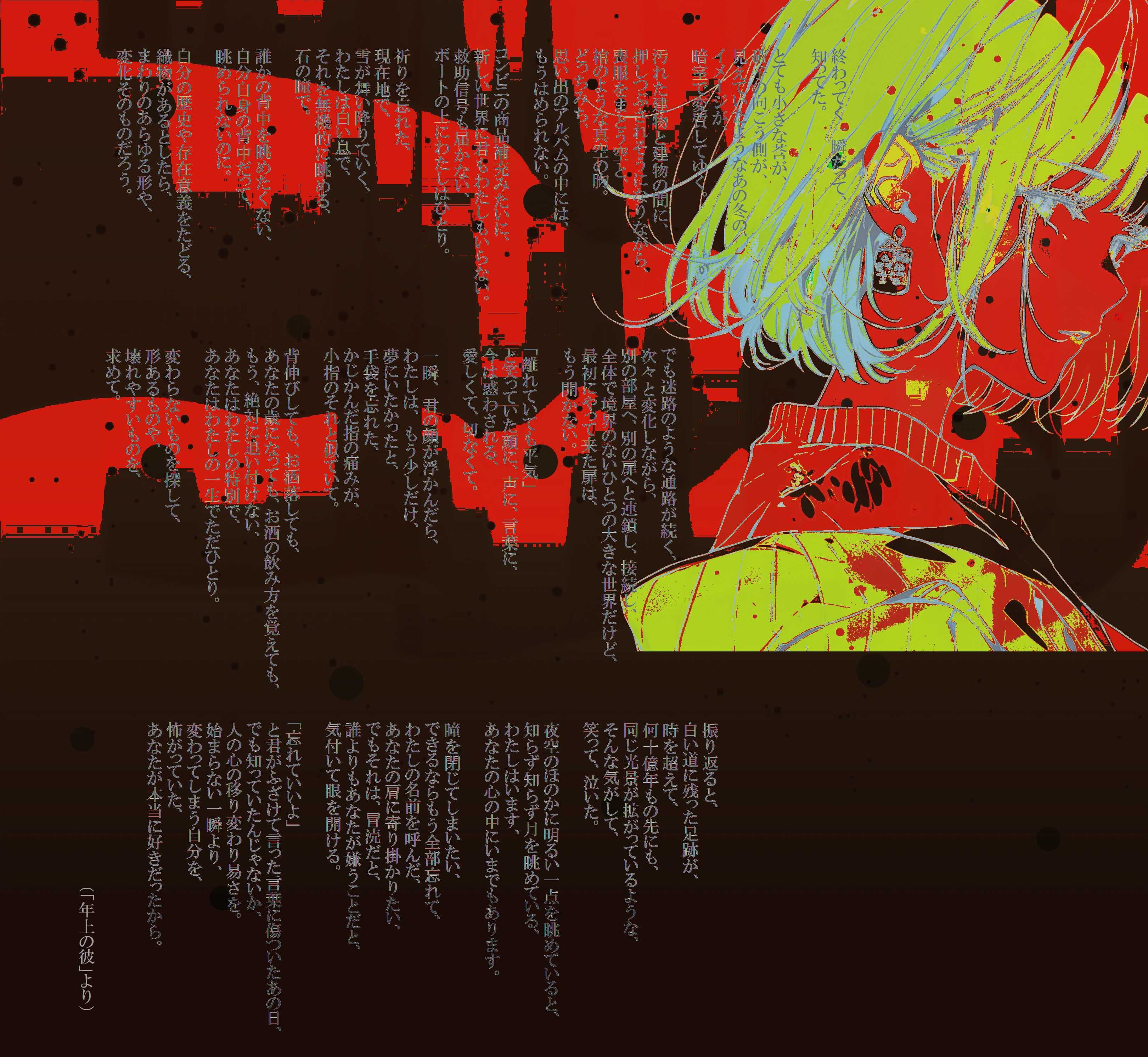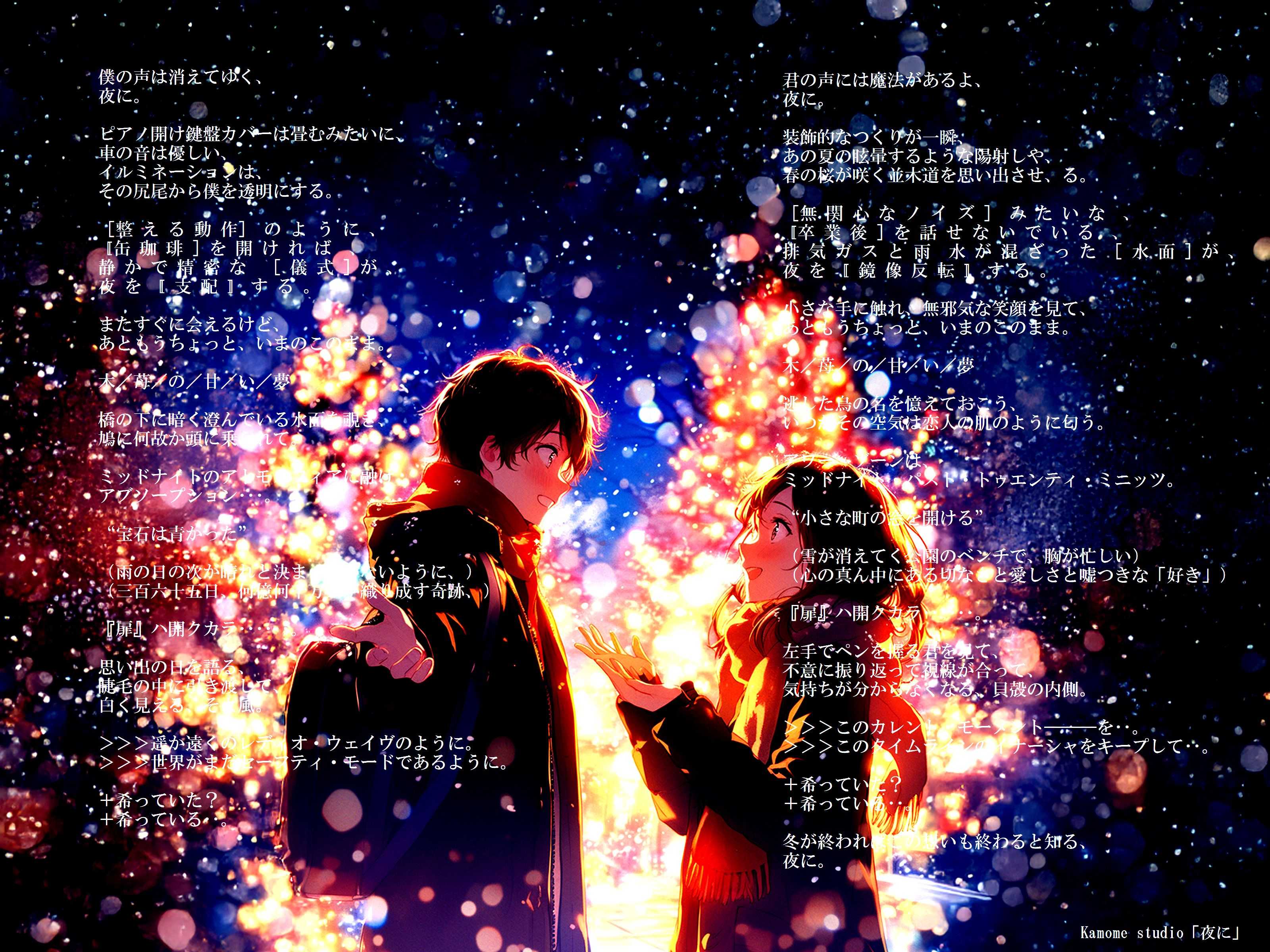 夜に 僕の声は消えてゆく、夜に。ピアノ開け鍵盤カバーは畳むみたいに、車の音は優しい、イルミネーションは、その尻尾から僕を透明にする。[整 え る 動 作] の よ う に 、〚缶 珈 琲 ]を 開 け れ ば 、静 か で 精 密 な [ 儀 式 ]が 、夜 を 〚 支 配 〛 す る 。またすぐに会えるけど、あともうちょっと、いまのこのまま。木/苺/の/甘/い/夢橋の下に暗く澄んでいる水面を覗き、鳩に何故か頭に乗られて。ミッドナイトのアトモスフィアに融け、アブソープション・・・。“宝石は青かった”(雨の日の次が晴れと決まっていないように、)(三百六十五日、何億何千万人が織り成す奇跡、)『扉』ハ開クカラ・・・・・・。思い出の日を語る、睫毛の中に引き渡して、白く見える、そよ風。>>>遥か遠くのレディオ・ウェイヴのように。>>>世界がまだセーフティ・モードであるように。+希っていた?+希っている・・。君の声には魔法があるよ、夜に。装飾的なつくりが一瞬、あの夏の眩暈するような陽射しや、春の桜が咲く並木道を思い出させ、る。[無 関 心 な ノ イ ズ ] み た い な 、〚卒 業 後 ]を 話 せ な い で い る 、排 気 ガ ス と 雨 水 が 混 ざ っ た [ 水 面 ]が 、夜 を 〚 鏡 像 反 転 〛 す る 。小さな手に触れ、無邪気な笑顔を見て、あともうちょっと、いまのこのまま。木/苺/の/甘/い/夢逃した鳥の名を憶えておこう、いつかその空気は恋人の肌のように匂う。アワー・ゾーンは、ミッドナイト・パスト・トゥエンティ・ミニッツ。“小さな町の窓を開ける”(雪が消えてく公園のベンチで、胸が忙しい)(心の真ん中にある切なさと愛しさと嘘つきな「好き」)『扉』ハ開クカラ・・・・・・。左手でペンを握る君を見て、不意に振り返って視線が合って、気持ちが分からなくなる、貝殻の内側。>>>このカレント・モーメント―――を・・。>>>このタイムラインのイナーシャをキープして・・。+希っていた?+希っている・・。冬が終わればこの想いも終わると知る、夜に。