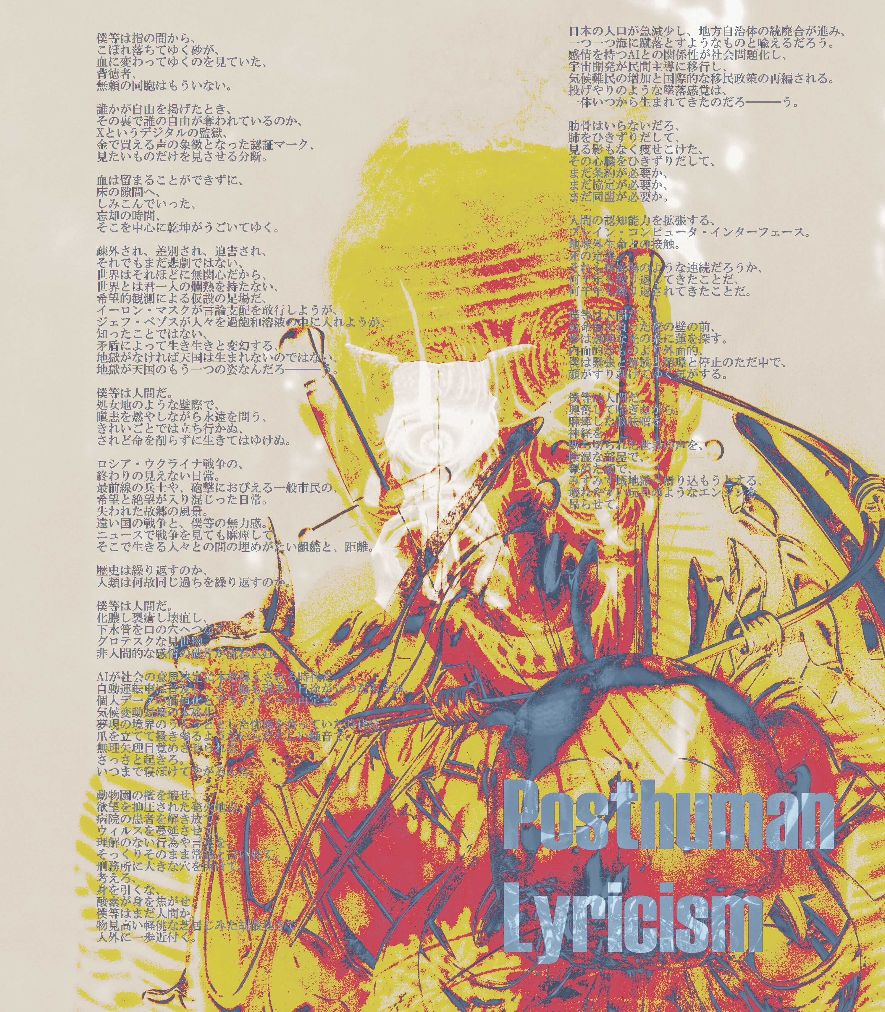 Posthuman Lyricism僕等は指の間から、こぼれ落ちてゆく砂が、血に変わってゆくのを見ていた、背徳者、無頼の同胞はもういない。誰かが自由を掲げたとき、その裏で誰の自由が奪われているのか、Xというデジタルの監獄、金で買える声の象徴となった認証マーク、見たいものだけを見させる分断。血は留まることができずに、床の隙間へ、しみこんでいった、忘却の時間、そこを中心に乾坤がうごいてゆく。疎外され、差別され、迫害され、それでもまだ悲劇ではない、世界はそれほどに無関心だから、世界とは君一人の爛熟を持たない、希望的観測による仮設の足場だ、イーロン・マスクが言論支配を敢行しようが、ジェフ・ベゾスが人々を過飽和溶液の中に入れようが、知ったことではない、矛盾によって生き生きと変幻する、地獄がなければ天国は生まれないのではない、地獄が天国のもう一つの姿なんだろ―――う。僕等は人間だ。処女地のような壁際で、瞋恚を燃やしながら永遠を問う、きれいごとでは立ち行かぬ、されど命を削らずに生きてはゆけぬ。ロシア・ウクライナ戦争の、終わりの見えない日常。最前線の兵士や、砲撃におびえる一般市民の、希望と絶望が入り混じった日常。失われた故郷の風景。遠い国の戦争と、僕等の無力感。ニュースで戦争を見ても麻痺して、そこで生きる人々との間の埋めがたい齟齬と、距離。歴史は繰り返すのか、人類は何故同じ過ちを繰り返すのか。僕等は人間だ。化膿し裂瘡し壊疽し、下水管を口の穴へつなぐ、グロテスクな見世物、非人間的な感情の破片が流れ込む。AIが社会の意思決定に本格導入される時代だ、自動運転車は普及し、人工脳も現実の目途が立つだろうか、個人データの価値化とプライバシーの再定義。気候変動対策の本格化。夢現の境界のうとうととした恍惚を貪っていた時代は、爪を立てて掻き毟るようないらだたしい騒音で、無理矢理目覚めさせられる。さっさと起きろ。いつまで寝ぼけてやがるんだ。動物園の檻を壊せ、欲望を抑圧された発火地点、病院の患者を解き放て、ウィルスを蔓延させて、理解のない行為や言葉を、そっくりそのまま常識と言い放て、刑務所に大きな穴を開けて、考えろ、身を引くな、酸素が身を焦がせ、僕等はまだ人間か、物見高い軽佻な芝居じみた胡散臭さで、人外に一歩近付く。日本の人口が急減少し、地方自治体の統廃合が進み、一つ一つ海に蹴落とすようなものと喩えるだろう。感情を持つAIとの関係性が社会問題化し、宇宙開発が民間主導に移行し、気候難民の増加と国際的な移民政策の再編される。投げやりのような墜落感覚は、一体いつから生まれてきたのだろ―――う。肋骨はいらないだろ、肺をひきずりだして、見る影もなく痩せこけた、その心臓をひきずりだして、まだ条約が必要か、まだ協定が必要か、まだ同盟が必要か。人間の認知能力を拡張する、ブレイン・コンピュータ・インターフェース。地球外生命との接触。死の定義。それも修羅場のような連続だろうか、何千年も繰り返してきたことだ、何千年も繰り返されてきたことだ。僕等は人間だ、致命傷を負った夜の壁の前、影は透明な光の糸に蓮を探す。内面的なものより外面的、僕は緊張と解放と循環と停止のただ中で、顔がすり剥けてゆく気がする。僕等は人間だ、興奮して喘ぎながら、麻痺した脳味噌を、神経を、断ち切られた世界の声を、陰湿な部屋で、顰めた顔で、みすみす蟻地獄へ滑り込もうとする、壊れやすい玩具のようなエンジンを、昂らせて。