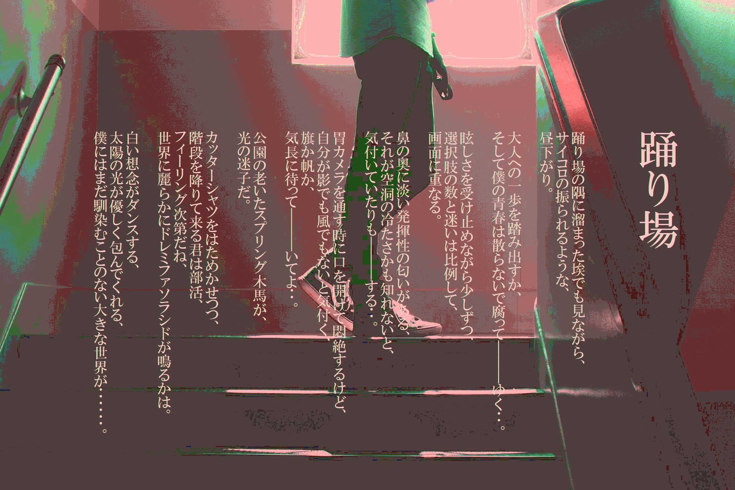 踊り場踊り場の隅に溜まった埃でも見ながら、サイコロの振られるような、昼下がり。大人への一歩を踏み出すか、そして僕の青春は散らないで腐って―――ゆく・・。眩しさを受け止めながら少しずつ、選択肢の数と迷いは比例して、画面に重なる。鼻の奥に淡い発揮性の匂いがある、それが空洞の冷たさかも知れないと、気付いていたりも―――する・・。胃カメラを通す時に口を開けて悶絶するけど、自分が影でも風でもないと気付く、旗か帆か、気長に待って―――いてよ・・。公園の老いたスプリング木馬が、光の迷子だ。カッターシャツをはためかせつつ、階段を降りて来る君は部活、フィーリング次第だね、世界に麗らかにドレミファソラシドが鳴るかは。白い想念がダンスする、太陽の光が優しく包んでくれる、僕にはまだ馴染むことのない大きな世界が・・・・・・。