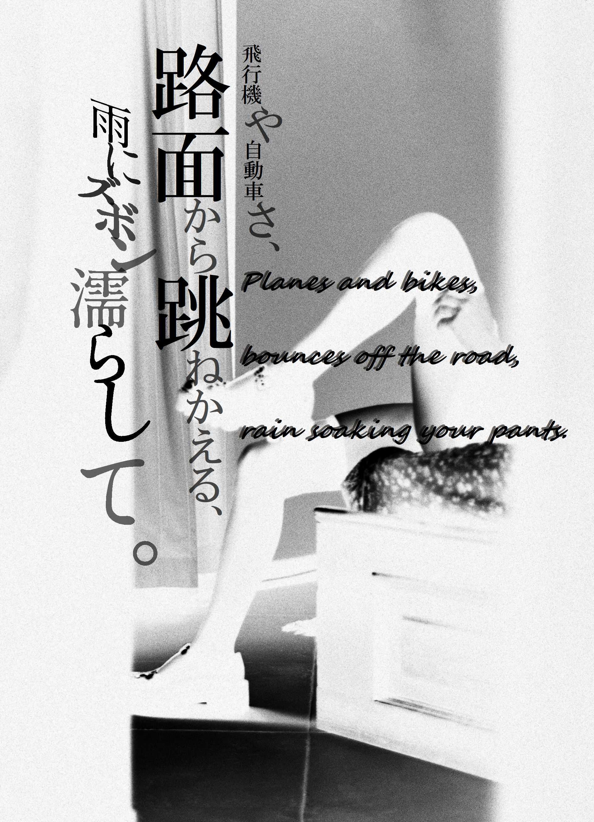 飛行機や自転車さ、路面から跳ねかえる、雨にズボン濡らして。Planes and bikes,bounces off the road,rain soaking your pants.