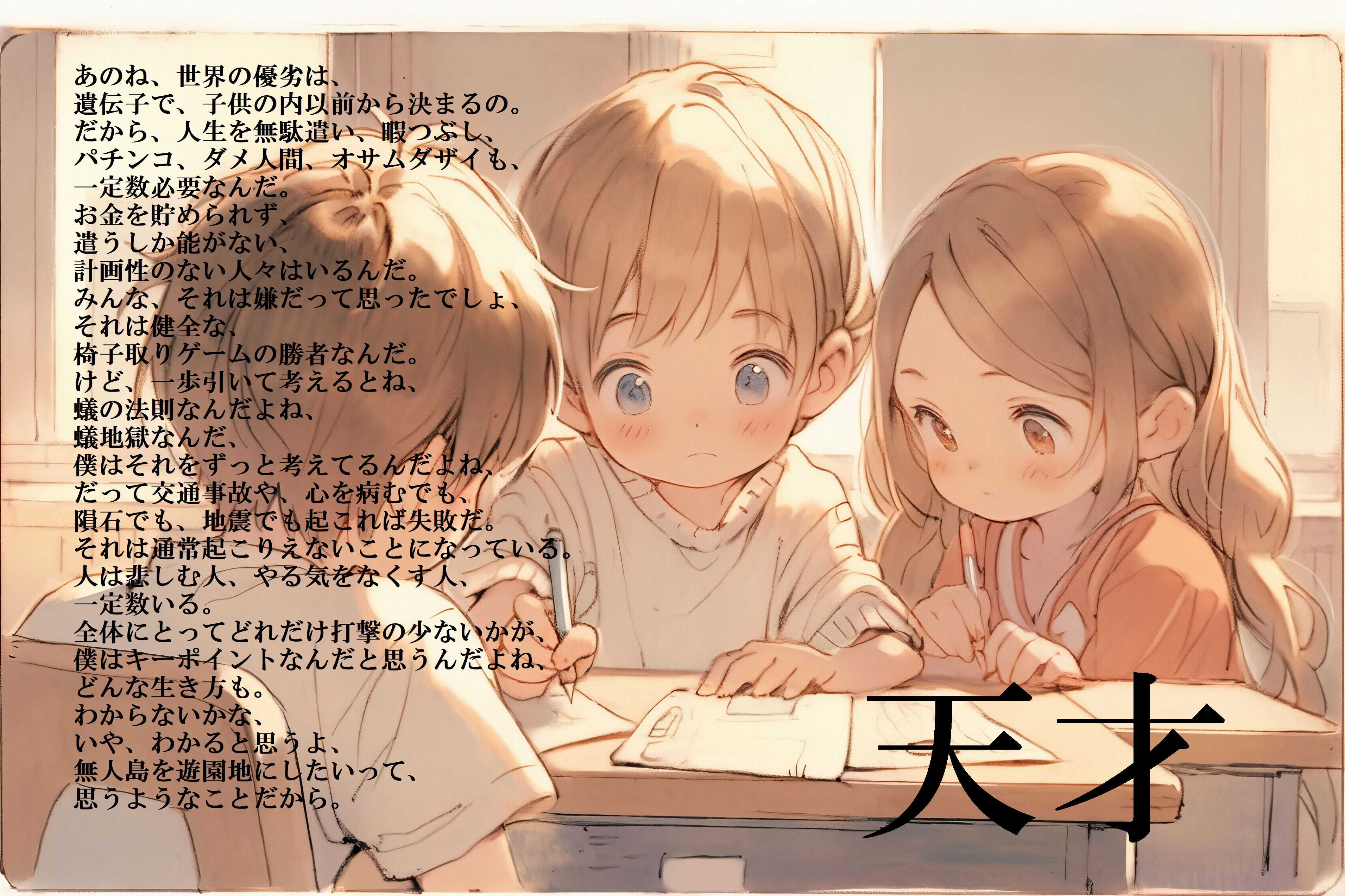 天才あのね、世界の優劣は、遺伝子で、子供の内以前から決まるの。だから、人生を無駄遣い、暇つぶし、パチンコ、ダメ人間、オサムダザイも、一定数必要なんだ。お金を貯められず、遣うしか能がない、計画性のない人々はいるんだ。みんな、それは嫌だって思ったでしょ、それは健全な、椅子取りゲームの勝者なんだ。けど、一歩引いて考えるとね、蟻の法則なんだよね、蟻地獄なんだ、僕はそれをずっと考えてるんだよね、だって交通事故や、心を病むでも、隕石でも、地震でも起これば失敗だ。それは通常起こりえないことになっている。人は悲しむ人、やる気をなくす人、一定数いる。全体にとってどれだけ打撃の少ないかが、僕はキーポイントなんだと思うんだよね、どんな生き方も。わからないかな、いや、わかると思うよ、無人島を遊園地にしたいって、思うようなことだから。