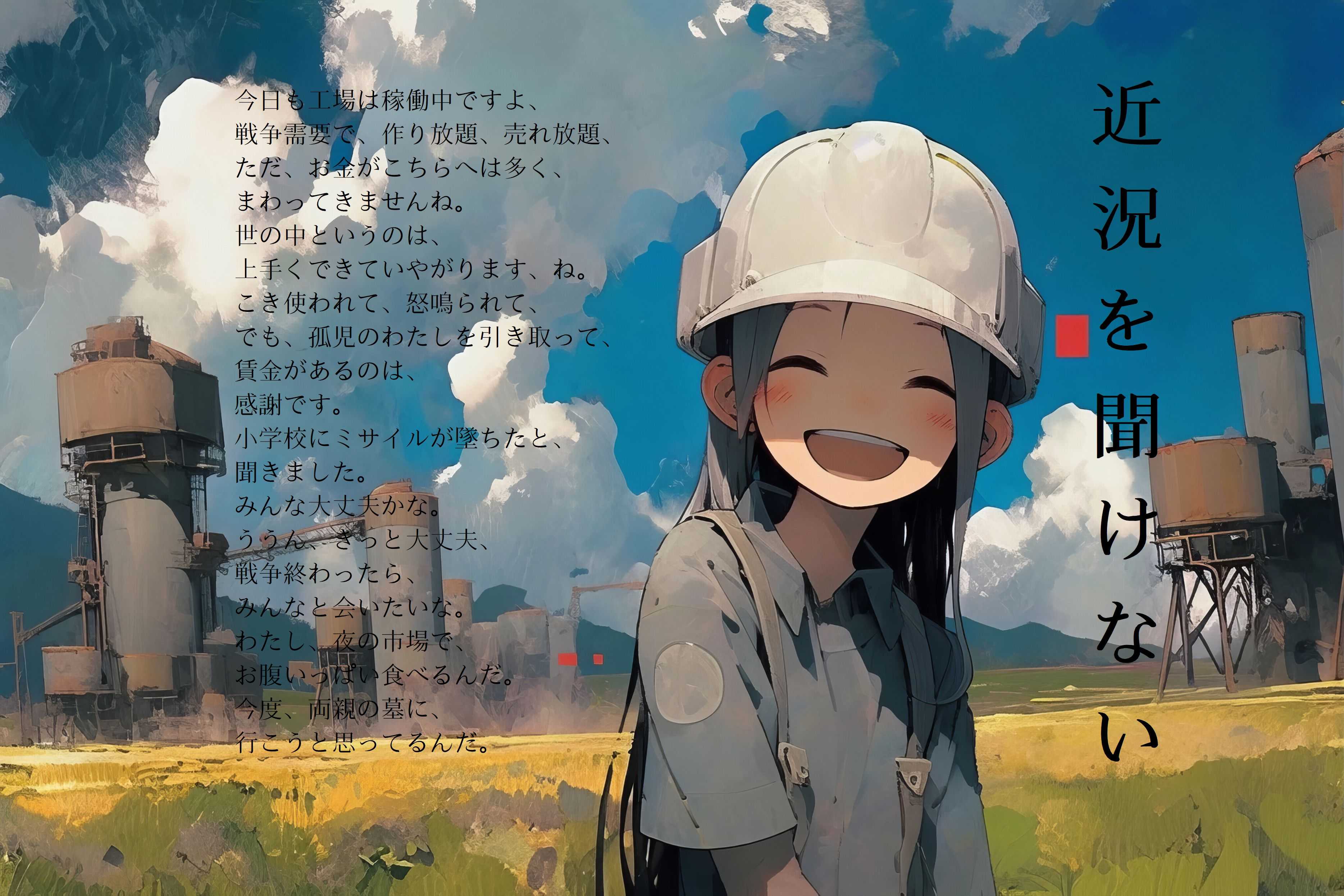 近況を聞けない今日も工場は稼働中ですよ、戦争需要で、作り放題、売れ放題、ただ、お金がこちらへは多く、まわってきませんね。世の中というのは、上手くできていやがります、ね。こき使われて、怒鳴られて、でも、孤児のわたしを引き取って、賃金があるのは、感謝です。小学校にミサイルが墜ちたと、聞きました。みんな大丈夫かな。ううん、きっと大丈夫、戦争終わったら、みんなと会いたいな。わたし、夜の市場で、お腹いっぱい食べるんだ。今度、両親の墓に、行こうと思ってるんだ。
