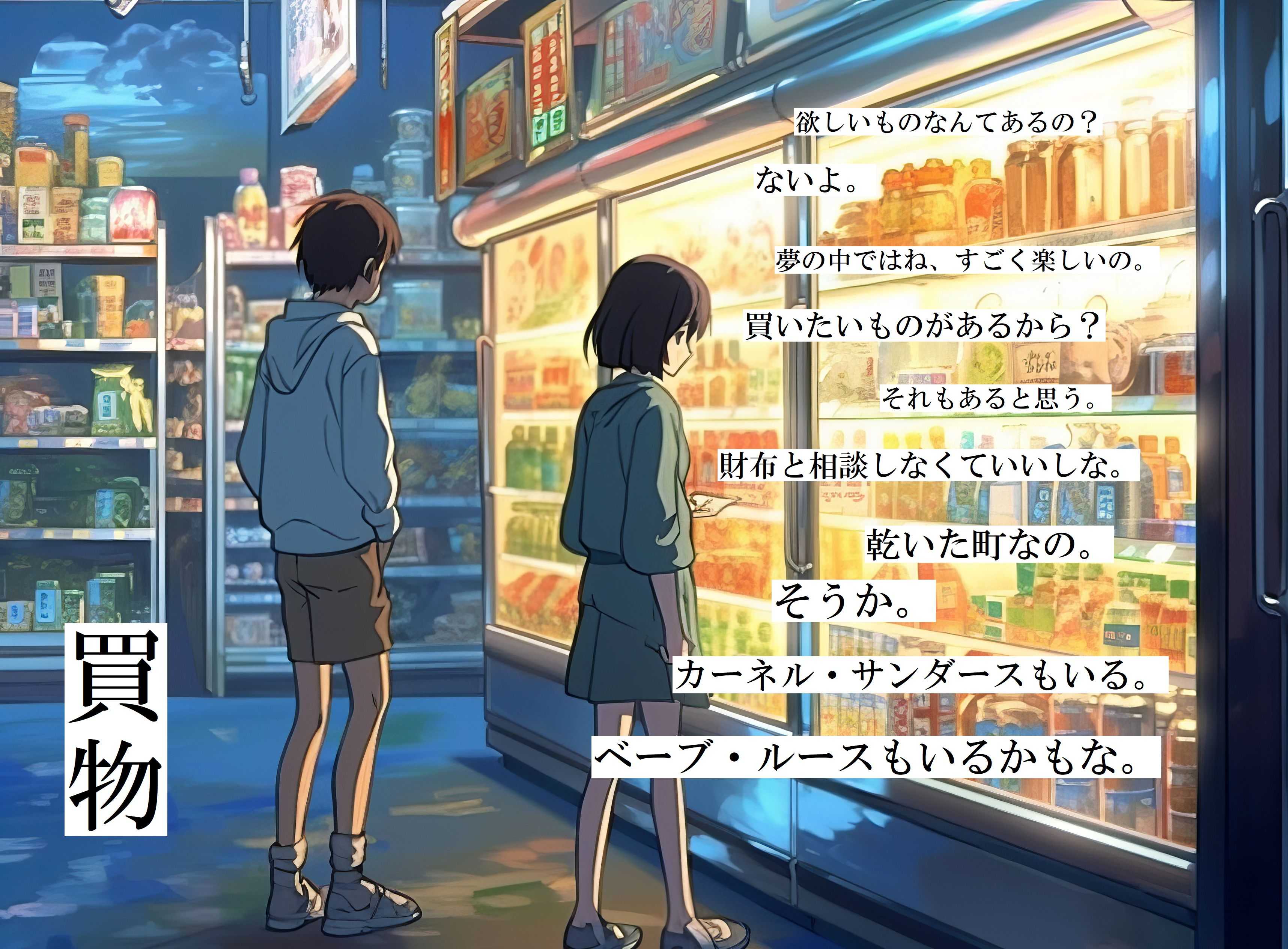 買物欲しいものなんてあるの?ないよ。夢の中ではね、すごく楽しいの。買いたいものがあるから?それもあると思う。財布と相談しなくていいしな。乾いた町なの。そうか。カーネル・サンダースもいる。ベーブ・ルースもいるかもな。