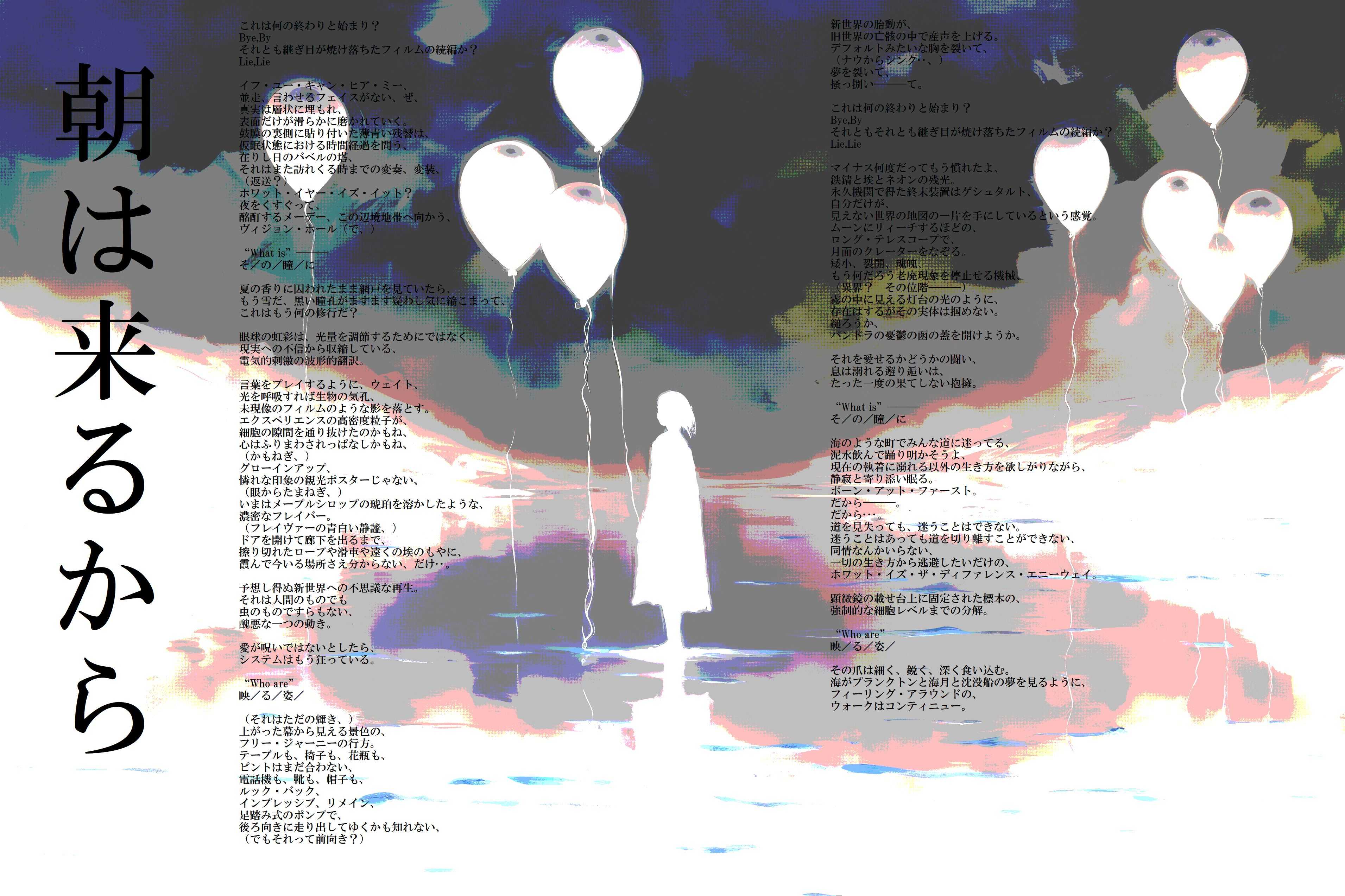 朝は来るからこれは何の終わりと始まり?Bye,Byそれとも継ぎ目が焼け落ちたフィルムの続編か?Lie,Lieイフ・ユー・キャン・ヒア・ミー、並走、言わせるフェイスがない、ぜ、真実は層状に埋もれ、表面だけが滑らかに磨かれていく。鼓膜の裏側に貼り付いた薄青い残響は、仮眠状態における時間経過を問う、在りし日のバベルの塔、それはまた訪れくる時までの変奏、変装、(返送?)ホワット・イヤー・イズ・イット?夜をくすぐって、酩酊するメーデー、この辺境地帯へ向かう、ヴィジョン・ホール(で、)“What is”―――そ/の/瞳/に夏の香りに囚われたまま網戸を見ていたら、もう雪だ、黒い瞳孔がますます疑わし気に縮こまって、これはもう何の修行だ?眼球の虹彩は、光量を調節するためにではなく、現実への不信から収縮している、電気的刺激の波形的翻訳。言葉をプレイするように、ウェイト、光を呼吸すれば生物の気孔、未現像のフィルムのような影を落とす。エクスペリエンスの高密度粒子が、細胞の隙間を通り抜けたのかもね、心はふりまわされっぱなしかもね、(かもねぎ、)グローインアップ、憐れな印象の観光ポスターじゃない、(眼からたまねぎ、)いまはメープルシロップの琥珀を溶かしたような、濃密なフレイバー。(フレイヴァーの青白い静謐、)ドアを開けて廊下を出るまで、擦り切れたロープや滑車や遠くの埃のもやに、霞んで今いる場所さえ分からない、だけ・・。予想し得ぬ新世界への不思議な再生。それは人間のものでも虫のものですらもない、醜悪な一つの動き。愛が呪いではないとしたら、システムはもう狂っている。“Who are”映/る/姿/(それはただの輝き、)上がった幕から見える景色の、フリー・ジャーニーの行方。テーブルも、椅子も、花瓶も、ピントはまだ合わない、電話機も、靴も、帽子も、ルック・バック、インプレッシブ、リメイン、足踏み式のポンプで、後ろ向きに走り出してゆくかも知れない、(でもそれって前向き?)新世界の胎動が、旧世界の亡骸の中で産声を上げる。デフォルトみたいな胸を裂いて、(ナウからシンク・・、)夢を裂いて、掻っ捌い―――て。これは何の終わりと始まり?Bye,Byそれともそれとも継ぎ目が焼け落ちたフィルムの続編か?Lie,Lieマイナス何度だってもう慣れたよ、鉄錆と埃とネオンの残光。永久機関で得た終末装置はゲシュタルト、自分だけが、見えない世界の地図の一片を手にしているという感覚。ムーンにリィーチするほどの、ロング・テレスコープで、月面のクレーターをなぞる。矮小、裂開、魂魄、もう何だろう老廃現象を停止せる機械、(異界? その位階―――)霧の中に見える灯台の光のように、存在はするがその実体は掴めない。縋ろうか、パンドラの憂鬱の函の蓋を開けようか。それを愛せるかどうかの闘い、息は溺れる邂り逅いは、たった一度の果てしない抱擁。“What is”―――そ/の/瞳/に海のような町でみんな道に迷ってる、泥水飲んで踊り明かそうよ、現在の執着に溺れる以外の生き方を欲しがりながら、静寂と寄り添い眠る。ボーン・アット・ファースト。だから―――。だから・・・。道を見失っても、迷うことはできない。迷うことはあっても道を切り離すことができない、同情なんかいらない、一切の生き方から逃避したいだけの、ホワット・イズ・ザ・ディファレンス・エニーウェイ。顕微鏡の載せ台上に固定された標本の、強制的な細胞レベルまでの分解。“Who are”映/る/姿/その爪は細く、鋭く、深く食い込む。海がプランクトンと海月と沈没船の夢を見るように、フィーリング・アラウンドの、ウォークはコンティニュー。
