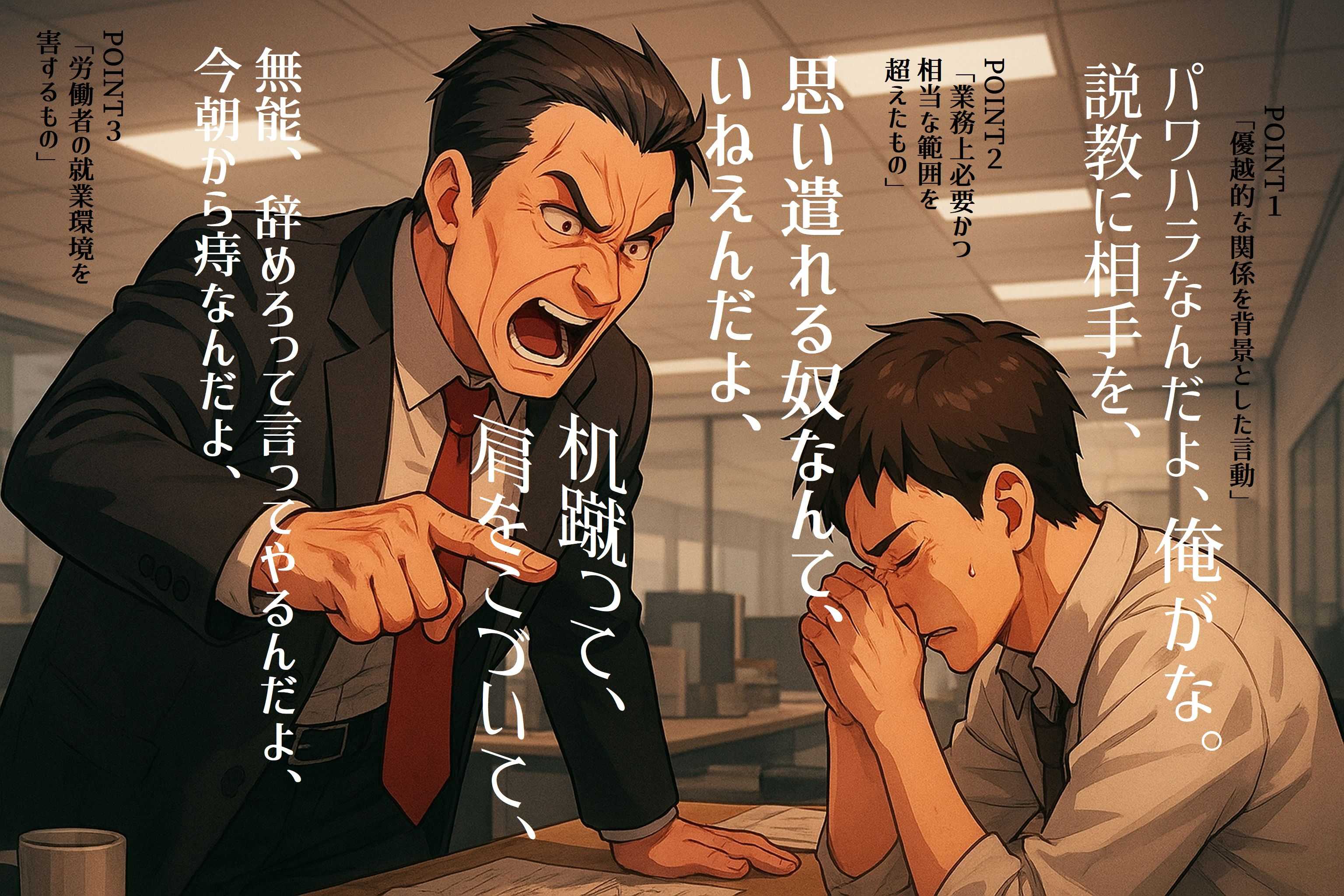 パワハラなんだよ、俺がな。説教に相手を、思い遣れる奴なんて、いねえんだよ、机蹴って、肩をこづいて、無能、辞めろって言ってやるんだよ、今朝から痔なんだよ、痔パワハラ、うりぃぃぃぃ!POINT1「優越的な関係を背景とした言動」POINT2「業務上必要かつ相当な範囲を超えたもの」POINT3「労働者の就業環境を害するもの」まさか痔だったんっすか、パワハラって、悲しいっすね、切ないっすね、早く死ねばいっすね、でも録音して、証言資料まとめて、さっき、社長に、サンタクロース、しときました、メリークリスマス、パワハラの、痔野郎くん、あと、社長が後で来いって、仰っておりましたよ、何か?POINT4「うつ病、退職、自己肯定感の低下」POINT5「職場秩序の乱れ、人材流出、訴訟リスク」POINT6「二〇二〇年以降、すべての事業主にパワハラ防止措置の義務化」