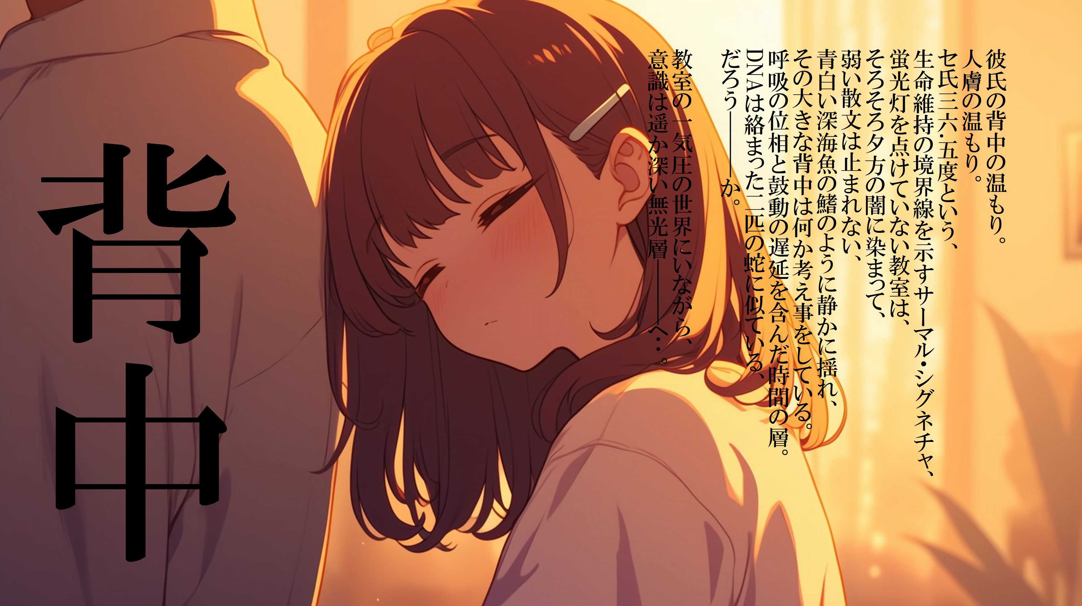 彼氏の背中の温もり。人膚の温もり。セ氏三六.五度という、生命維持の境界線を示すサーマル・シグネチャ、蛍光灯を点けていない教室は、そろそろ夕方の闇に染まって、弱い散文は止まれない、青白い深海魚の鰭のように静かに揺れ、その大きな背中は何か考え事をしている。呼吸の位相と鼓動の遅延を含んだ時間の層。DNAは絡まった二匹の蛇に似ている、だろう―――か。教室の一気圧の世界にいながら、意識は遥か深い無光層―――へ・・。制服のリネンが夕焼けに映え、紺のスカートの皺がたわむれる。埃は光の帯を切り分け、微小な粒子はカメラのシャッター速度でしか、捕らえられないリズムを刻む。暗流を遡る冷やかな鮭の群れのように均一な速度で流れた、チャイムが鳴ってフェードアウトしていく、腐った木造の階段をのぼっているような気がする。密度のある暗がりは幾重にも重なり、奥へ奥へと続く迷路のように空間を圧縮していく。不安定な感覚が足裏から伝わってくるから、寄り掛かる―――んだ・・。薄暗い玄関、自分の部屋のベッドのシーツの影、そんなものを思い出していると、そろそろ帰らないかと声をかけてくる。異論を廃して、真夏の疾走感を喰らった先にある、通学鞄のファスナーには、小さな金属のチャームが一つぶら下がり、そこにはパリの古いメトロの路線図の縮図が、刻まれているようにも見える。人の心を知った気になって、笑う気分はどうだい?否応なしに、名前が追い掛けて来る。夢の続きを見ているわけにはいかない、だってわたし達は、ここに住んでいるわけではない。この教室という仮設の舞台装置に、一時的に配置されたアクターに過ぎない。あともう少し、それは十五分後で収束する。何を言われても超然と澄ましきってたい。あともうちょっと、それは黄昏の終わり。何を言われても萎靡して振るわない耳底。両眼視差による立体視が機能しなくなり、遠近法的な手がかりだけが、距離を推定する唯一の情報源となる。人は暗闇を遠ざける、でも暗闇の中でだけ、さらけ出せる本音というのも―――ある。横顔は黄昏れに溶ける、窓硝子越しに頬を撫でる光。睫毛の影が長く伸びて、机の上の教科書の頁を揺らし、繊細な縞模様を投影する。やがて闇の粒子が網膜に不思議な図形を描き、モアレ・パターン、テクスチャード・ハロー。描かれた図形はしばらくすると音もなく崩れ、別の図形が描き出され、水銀のように静止した空間の中で、闇だけが動いている。天文学の観測写真のような、目蓋を閉じた黒い空間に光の残像・・・・・・。ハッブル・ディープ・フィールドのような、無限の過去と未知の現在が交錯する、空間の記録。放課後の空気が陽だまりの中で色を変え、スカートの襞がオレンジに、染まっていく気がする。カーテンの隙間からあまい光が射し、結末はまだ定まらない。放課後の光は静かに塗り替えられ、スカートの襞はさらに深い橙へと変わり、カーテンの隙間を抜けた光は、まるで演出家がそっと舞台の角度を調整したかのように、二人の影を長く伸ばしてゆく、その曖昧な表現のその先に、ディストピアがあるのかどうか、教室の静寂に包まれながら、教室の時計の針だけが動いて―――いる・・。