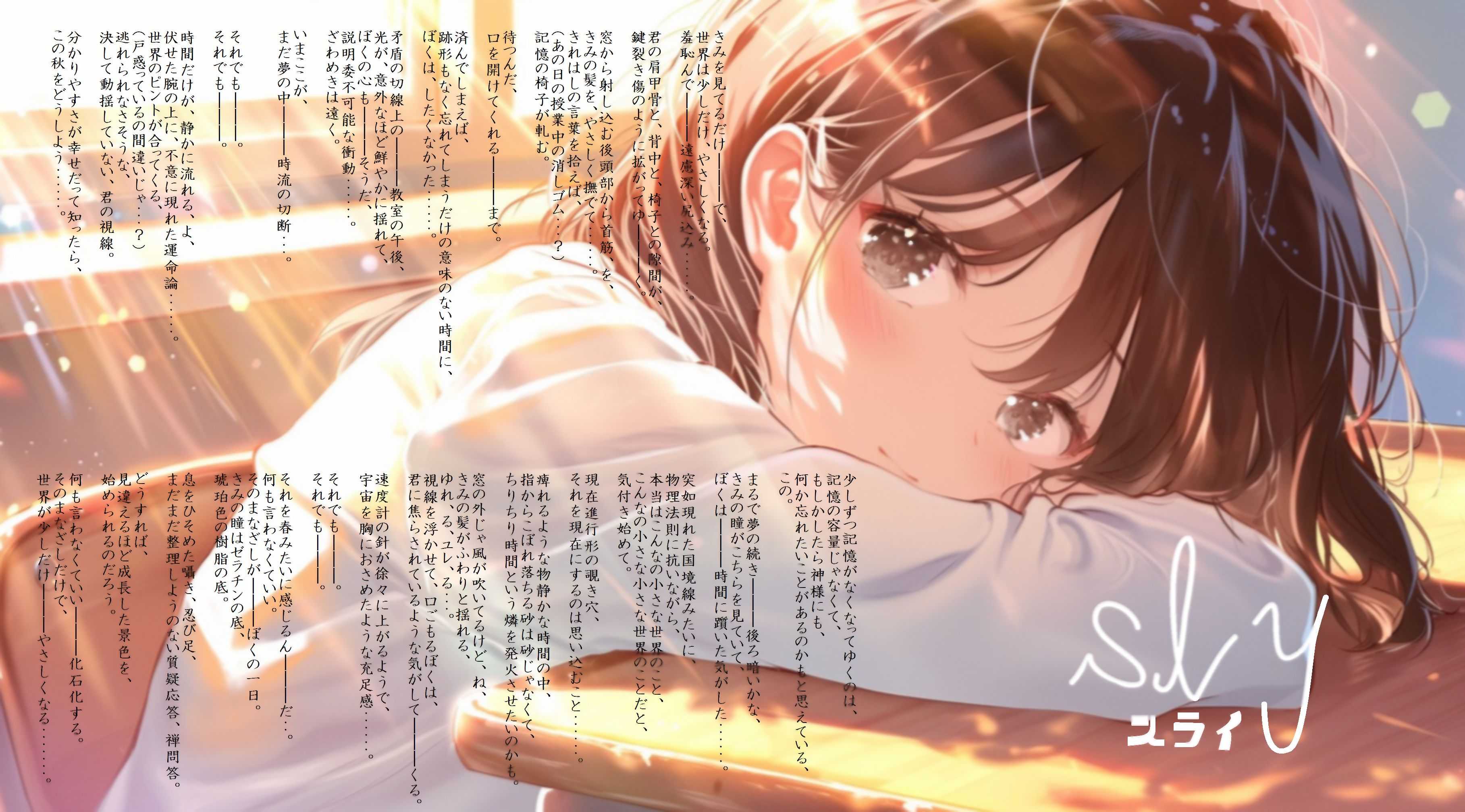 slyきみを見てるだけ―――で、世界は少しだけ、やさしくなる。羞恥んで―――遠慮深い尻込み・・・・・・。君の肩甲骨と、背中と、椅子との隙間が、鍵裂き傷のように拡がってゆ―――く。窓から射し込む後頭部から首筋、を、きみの髪を、やさしく撫でて・・・・・・。きれはしの言葉を拾えば、(あの日の授業中の消しゴム・・・?)記憶の椅子が軋む。待つんだ、口を開けてくれる―――まで。済んでしまえば、跡形もなく忘れてしまうだけの意味のない時間に、ぼくは、したくなかった・・・・・・。矛盾の切線上の―――教室の午後、光が、意外なほど鮮やかに揺れて、ぼくの心も―――そうだ、説明委不可能な衝動・・・・・・。ざわめきは遠く。いまここが、まだ夢の中―――時流の切断・・・。それでも―――。それでも―――。時間だけが、静かに流れる、よ、伏せた腕の上に、不意に現れた運命論・・・・・・。世界のピントが合ってくる、(戸惑っているの間違いじゃ・・・?)逃れられなさそうな、決して動揺していない、君の視線。分かりやすさが幸せだって知ったら、この秋をどうしよう・・・・・・。少しずつ記憶がなくなってゆくのは、記憶の容量じゃなくて、もしかしたら神様にも、何か忘れたいことがあるのかもと思えている、この。まるで夢の続き―――後ろ暗いかな、きみの瞳がこちらを見ていて、ぼくは―――時間に躓いた気がした・・・・・・。突如現れた国境線みたいに、物理法則に抗いながら、本当はこんなの小さな世界のこと、こんなの小さな小さな世界のことだと、気付き始めて。現在進行形の覗き穴、それを現在にするのは思い込むこと・・・・・・。痺れるような物静かな時間の中、指からこぼれ落ちる砂は砂じゃなくて、ちりちり時間という燐を発火させたいのかも。窓の外じゃ風が吹いてるけど、ね、きみの髪がふわりと揺れる、ゆれ、る、ユレ、る・・・。視線を浮かせて、口ごもるぼくは、君に焦らされているような気がして―――くる。速度計の針が徐々に上がるようで、宇宙を胸におさめたような充足感・・・・・・。それでも―――。それでも―――。それを春みたいに感じるん―――だ・・。何も言わなくていい。そのまなざしが―――ぼくの一日。きみの瞳はゼラチンの底、琥珀色の樹脂の底。息をひそめた囁き、忍び足、まだまだ整理しようのない質疑応答、禅問答。どうすれば、見違えるほど成長した景色を、始められるのだろう。何も言わなくていい―――化石化する。そのまなざしだけで、世界が少しだけ―――やさしくなる・・・・・・・。