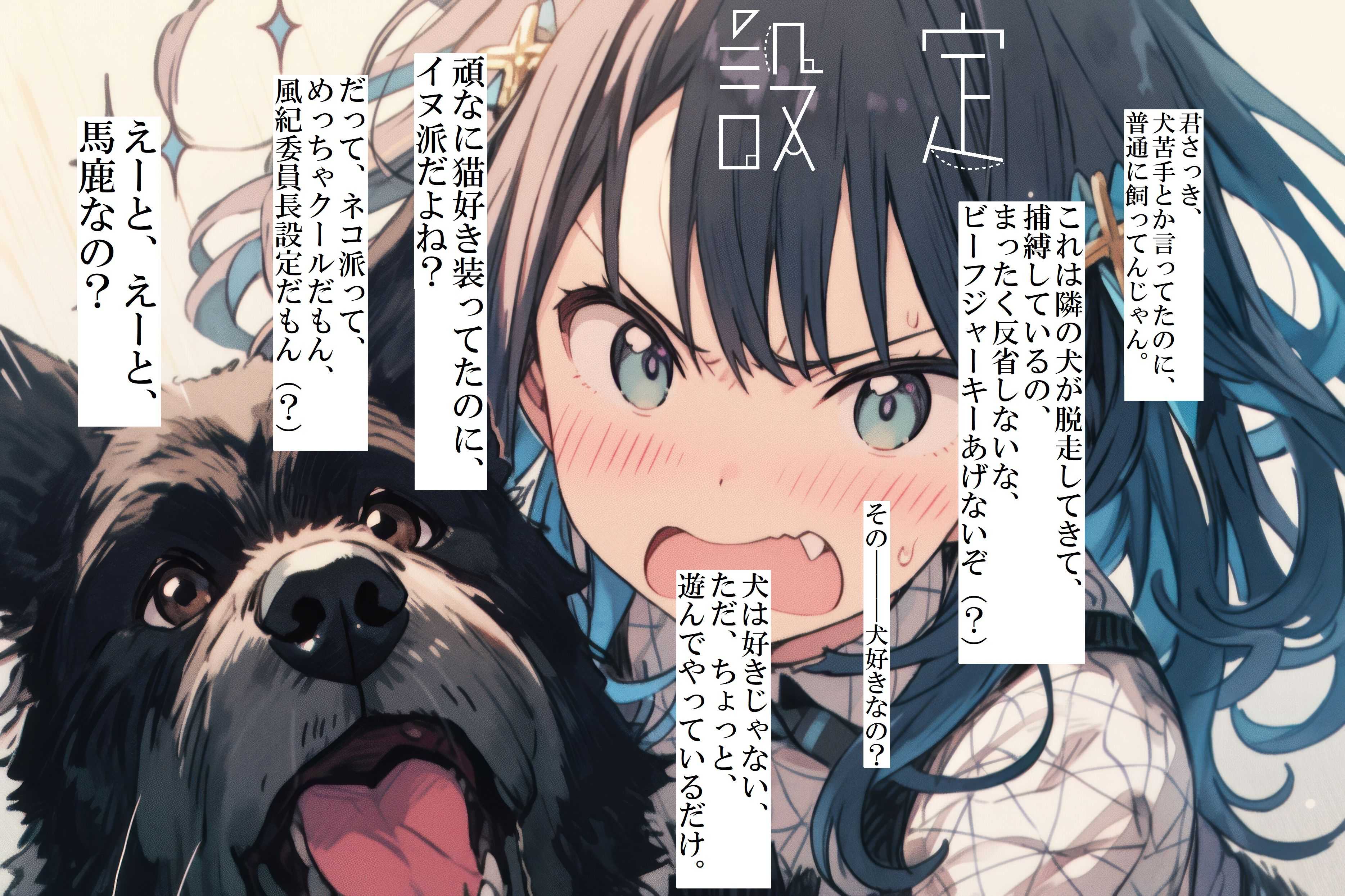 設定君さっき、犬苦手とか言ってたのに、普通に飼ってんじゃん。これは隣の犬が脱走してきて、捕縛しているの、まったく反省しないな、ビーフジャーキーあげないぞ(?)その―――犬好きなの?犬は好きじゃない、ただ、ちょっと、遊んでやっているだけ。頑なに猫好き装ってたのに、イヌ派だよね?だって、ネコ派って、めっちゃクールだもん、風紀委員長設定だもん(?)えーと、えーと、馬鹿なの?