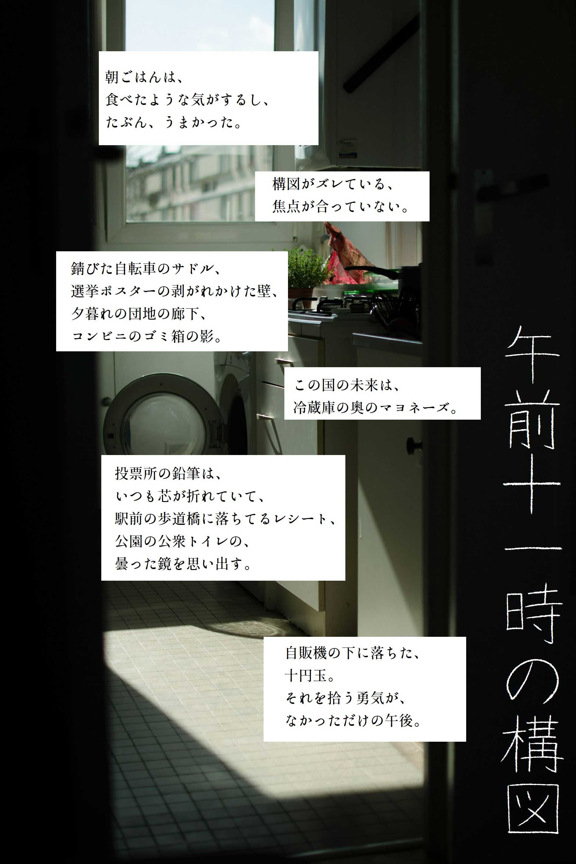 午前十一時の構図朝ごはんは、食べたような気がするし、 たぶん、うまかった。構図がズレている、焦点が合っていない。錆びた自転車のサドル、選挙ポスターの剥がれかけた壁、夕暮れの団地の廊下、コンビニのゴミ箱の影。この国の未来は、冷蔵庫の奥のマヨネーズ。投票所の鉛筆は、いつも芯が折れていて、駅前の歩道橋に落ちてるレシート、公園の公衆トイレの、曇った鏡を思い出す。自販機の下に落ちた、十円玉。それを拾う勇気が、なかっただけの午後。
