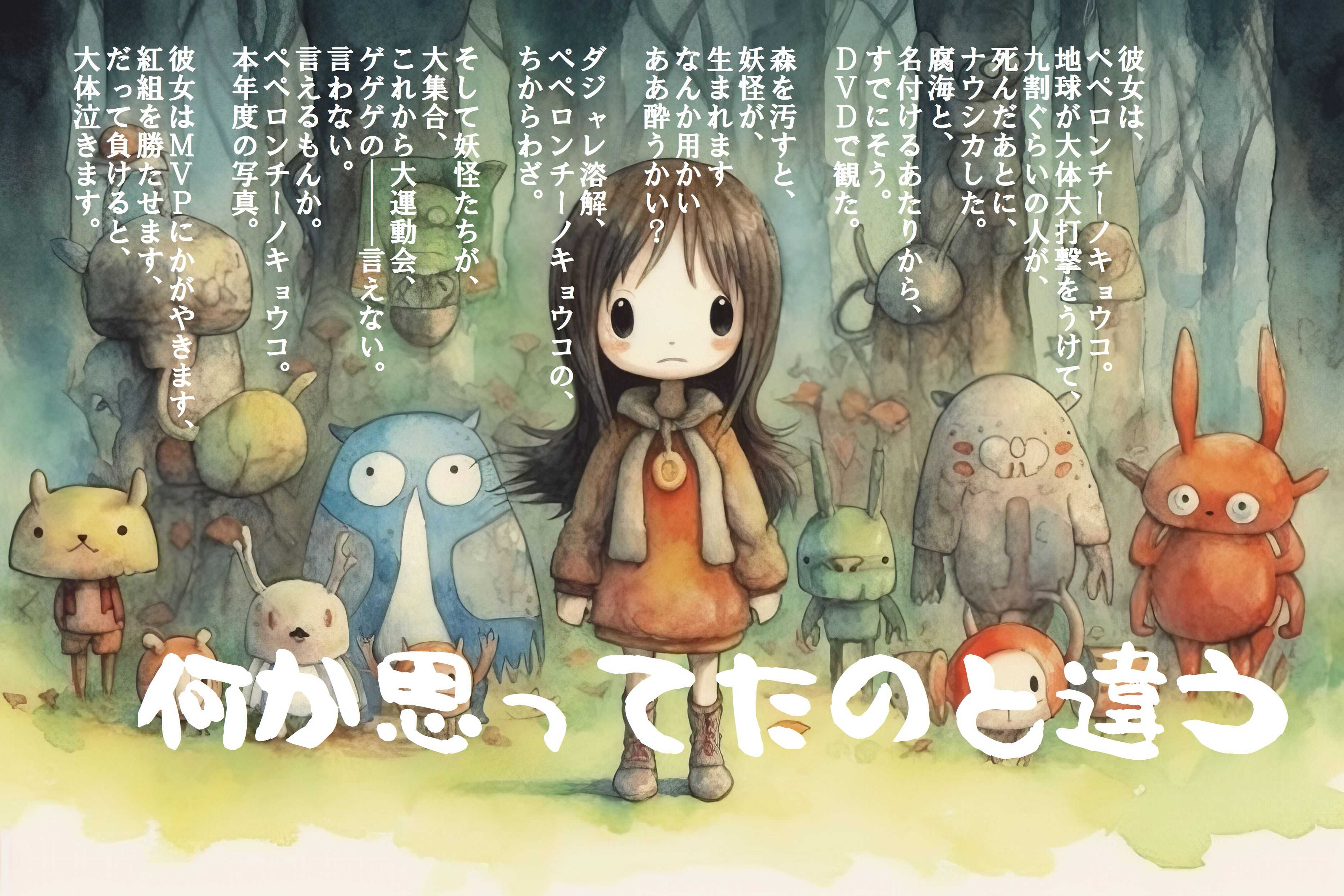 何か思ってたのと違う彼女は、ペペロンチーノキョウコ。地球が大体大打撃をうけて、九割ぐらいの人が、死んだあとに、ナウシカした。腐海と、名付けるあたりから、すでにそう。DVDで観た。森を汚すと、妖怪が、生まれますなんか用かいああ酔うかい?ダジャレ溶解、ペペロンチーノキョウコの、ちからわざ。そして妖怪たちが、大集合、これから大運動会、ゲゲゲの―――言えない。言わない。言えるもんか。ペペロンチーノキョウコ。本年度の写真。彼女はMVPにかがやきます、紅組を勝たせます、だって負けると、大体泣きます。