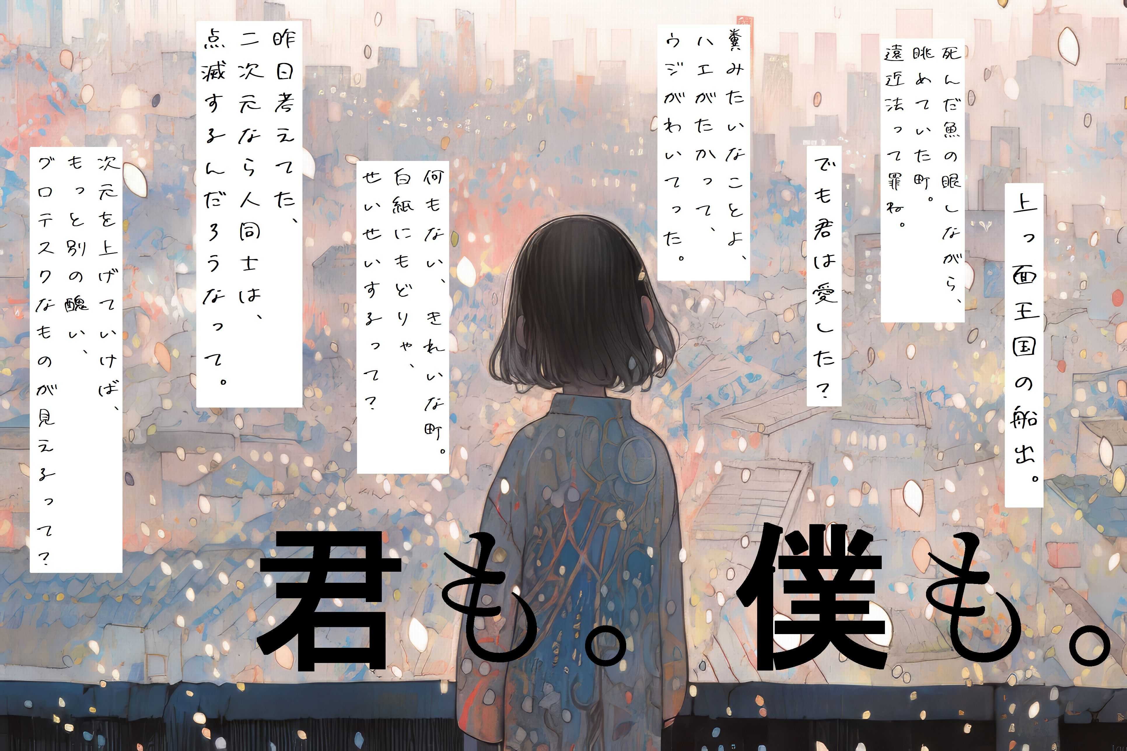 君も。僕も。上っ面王国の船出。死んだ魚の眼しながら、眺めていた町。遠近法って罪ね。でも君は愛した?糞みたいなことよ、ハエがたかって、ウジがわいてった。何もない、きれいな町。白紙にもどりゃ、せいせいするって?昨日考えてた、二次元なら人同士は、点滅するんだろうなって。次元を上げていけば、もっと別の醜い、グロテスクなものが見えるって?