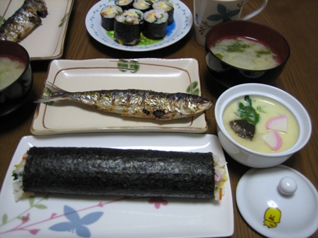 今日は、節分ということで、恵方巻きを作ってみました☆メニュー☆恵方巻きいわしの塩焼き茶碗蒸し大根のお味噌汁恵方巻き断面今年は、東北東ということでそっちを向いて一口だけ丸かぶりして、後はお上品に切って食べましたこれで、今年一年健康に過ごせたらいいなー(^^)