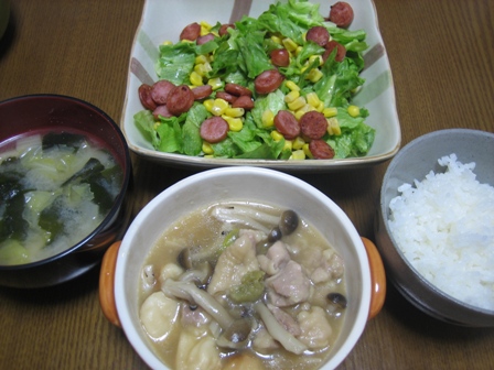 昨日は、旅行の疲れから、一日二人でだらだらテレビを見てすごし、夜は旦那さんの実家でご馳走になるという、だらだらDAYをすごしました。。。くまぽんでーす今日から旦那さんも仕事なので、私も主婦モードを取り戻すべく朝から買い物へ!旅行前に冷蔵庫空にして出かけたので、たんまり買いました!これで1週間はもつかな☆今日の晩御飯は3分間クッキングでやってた鶏肉のじぶ煮サラダ味噌汁ご飯納豆でーす。じぶ煮は、旦那さんに不評でした。。。「なんか粉っぽーい。。。」そうです。確かに、とろみを小麦粉でつけるけど、そんなに気になるかー。。。ふむふむ今後の参考にさせていただきやす!