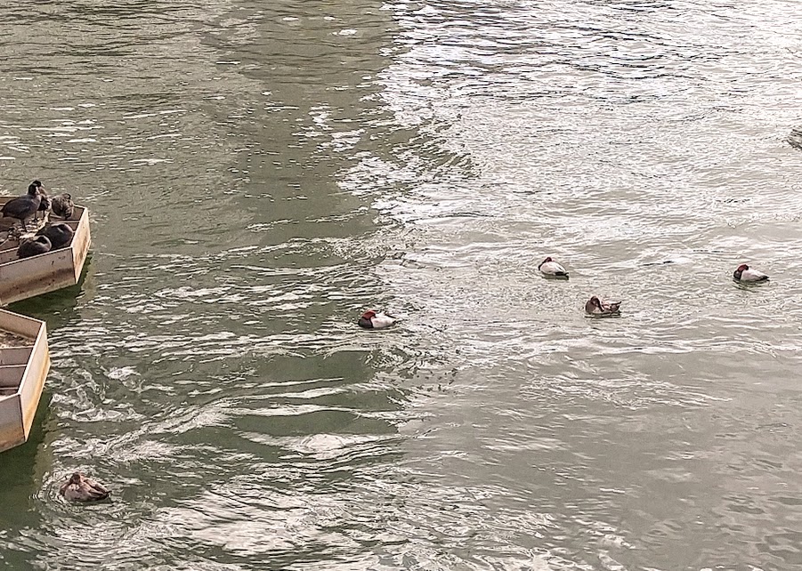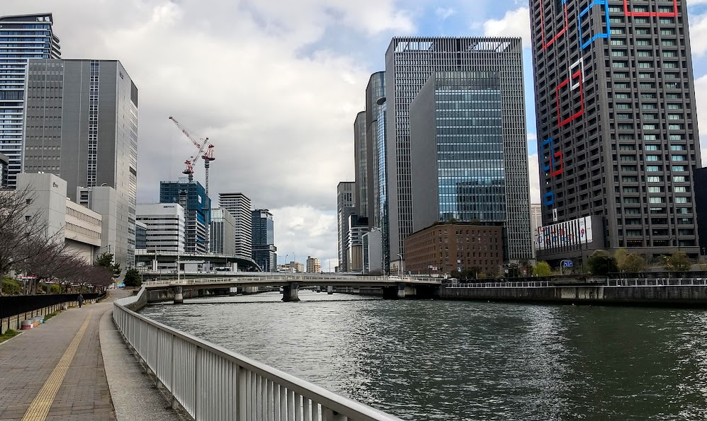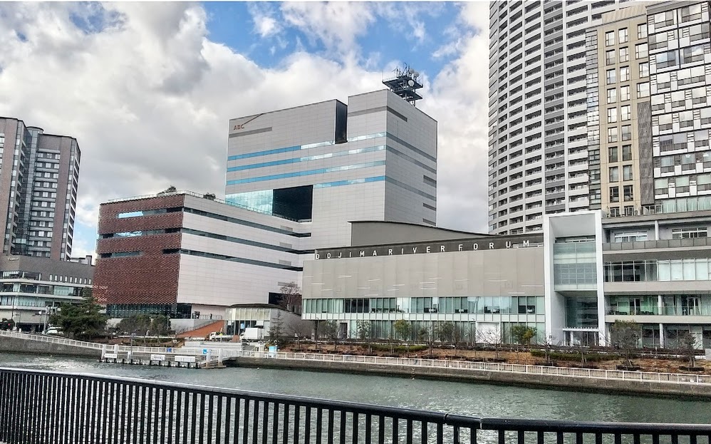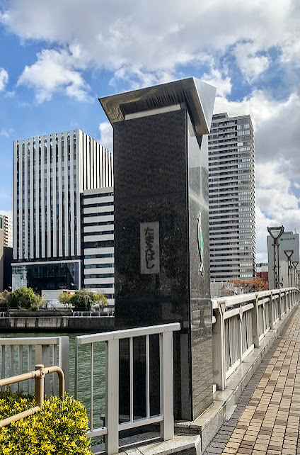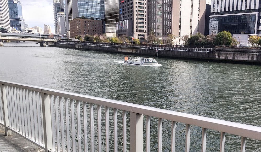 あっ、水上バスがやって来ました。 座っている場所が リバー・クルーズ とかの ほたるまち港 とかいう 船着き場 です。もっともやってきた船は作業用の船のようで、前を通り過ぎて行ってしまいましたけど。