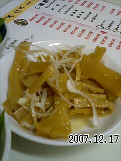浅草は羽子板市。でも平日なので仕事で行けませんでした。嫁も珍しく仕事が忙しく、夕食は外食となりました。外食と言っても、いつもの復興軒。でもうまかった。おつまみメンマ。これ絶品。