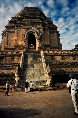 本堂の背後にそびえる石の仏塔チェディ・ルアンは16世紀の大地震で半壊し現在に至っています。