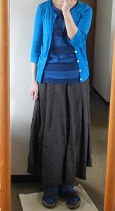 こんばんは♪今日は朝からどんよりした曇り空。涼しいのはいいんだけど、湿気があって梅雨のような空気で。今日のコーデは、その天気に影響されたのかダークな色合いの服を選んでいたのですが元気が出るように、カーデは鮮やかなブルーをチョイス。pritparadishitayaFrench BullARCOPEDICOもう何年も前のソフトフライスカーデは私には珍しい色で、アクアって色名だったかなー。こんなはっきりした色の服ってこれ以外持ってない(笑) ARCOPEDICO、お安くなってますkayoちゃんもkiraraちゃんもやこちゃんもすごくきちんとワードローブを分析して自分に似合うもの・必要なものを残しているよね☆私も少しずつ服の処分はしているんだけど何だか中途半端で、クローゼットもイマイチすっきりしなくて。昨日は午後から、今の季節のもので今年着たもの・着ようと思うもの を全部出してアイテムごとに吊るして眺めてみた。もう、色が偏ってて……笑えるくらい。ネイビー・白・ブルー(特にシャンブレー系多しw)・ベージュ・黒・茶これ以外は、ほぼない!柄物もその色目のボーダー・水玉・ちょっとチェック。合わせやすいと言えばそうだけどいつも同じの着てると思われてるかもしれないwまぁ、落ち着くし、結局そういうのがずっと好きなのよね。だから、多分これからもその路線は変わらない気がするけどそのわりには似たようなものが有りすぎ…って思った。実は、一軍から外れた、吊るさなかったものもたくさん。これはもう着ないってものは、去年整理したつもりだったのにまだまだだと再認識できました。一軍から外れたものをまず何とかしよう。義母のことも落ち着いて娘も部活でいないことが多く、前より一人時間増えた今…がんばる!!また変化があれば書きますね。・・・今日の気になったものSAYAのパンプス、20%OFFみんな気になってるランドソックス。私は去年ブルーグレー買いそびれたのでまずはそれがほしいな。では、今夜はこのあたりで。今日も読んでいただきありがとうございました!!ナチュラルさんの今日のコーデ