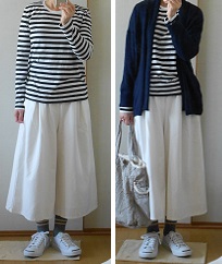 おはようございます♪また、昨日の分の日記ですが今アップです^^;・・今日も晴れて、春らしい1日でした。午前中は洗濯・掃除をしてたらあっという間に過ぎちゃった。午後から片づけをと思っていましたが娘が部活で必要なものがあると言いだしスポーツ店のあるSCまで買い物へ~その時のコーデです。しまむらの白ワイドパンツ、穿いてみました。カーデ・バッグ pritボーダー 無印良品パンツ しまむらソックス French Bullスニーカー JACK PURCEL 無難に白黒ボーダーで。数年前のpritのカーデは、今の時期ちょうどいい感じ。ワイドパンツはLだからか、ふんわり感ありますね。Mだともう少し腰まわりタイトな感じになってました。試着の時はそれがいいと思ったけど私の身長だと太って見えるかなー?(まぁ、実際腰まわりは立派なのでね><)でも、白のボトムスってそれだけで春らしくなる☆汚れも気にせず穿けちゃうプチプラが嬉しい!もっと素敵に着られるように、コーデも考えてみます*^^*品番ですスニーカーはすでにヘビロテのジャックパーセル。履きやすく合わせやすいので、ついついこればかりになる^^;ソックスは、フレンチブルの去年人気だったラインソックスですがまだちょっと寒かったので、外出直前に他のものに変えました。ナチュラルさんの今日のコーデ*ファッションセンター しまむら* ユニクロ・しまむら・西松屋deルンルン♪・・気になるもの♪ゴールドもシルバーもどちらもいいな~~☆200円OFFクーポン使えますスーパーセールで買おうかな^^ 1980円 ナチュラルシンプルスタイル大人ナチュラルファッションが好き・今日も最後までお読みいただきありがとうございました!ぽちっとの応援が更新の励みになっています^^ありがとうございます!!