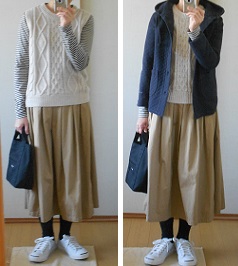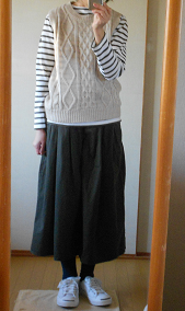 こんばんは^^ご訪問ありがとうございます♪今日は19時からのスーパーセールでフラカップが気になってましたが、外出してて帰宅したのが19時過ぎ。。前の日記に書いたベストを買って、夕飯にしました。(ご飯の支度は出かける前にしてあったので)ベストも前もってお知らせしたいと思ってたけどできなくて、遅くなってしまいました。。時間の使い方、やっぱりヘタだなー私。。昨日も、結局昼の用意などしてるうちに娘が帰宅その後も着画は撮れずに終わりました~^^;今日も娘は部活だったので、早いうちにさっさと着画を撮りました*^^*ベスト Basic Styleカットソー naruスカート GRANDMA MAMA DAUGHTER ジャケット Le Glazikソックス チュチュアンナスニーカー ジャックパーセルバッグ marimekkoグランマ、洗濯してるうちに少しなじんできた感じ。前よりボリューム感控えめになったかなって。横からの画像。勇気がいりますwブルーコムさん、20%OFF使えます♪naruのカットソーはカーキ系の細かいボーダー。着てるベスト、編み柄の感じとかかなりお気に入り^^売り切れてたのがここへ来て再入荷!!で、スーパーセールに入って購入したというわけです。お得な時間は終わってしまったけど10%OFFクーポンは使えるし、3150円以上送料無料です☆ナチュラルさんの今日のコーデ大人ナチュラルファッションが好きこれからちょっとお買い物して、また出てこようと思ってます^^ここまで、読んでいただきありがとうございました!ぽちっとしていただけると嬉しいです^^いつもありがとうございます!