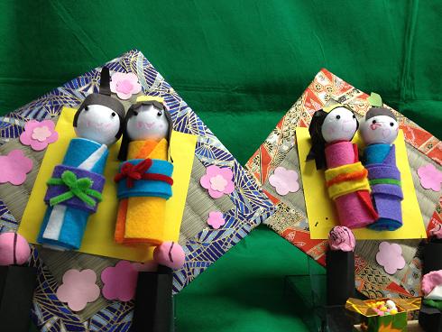 こんにちは。可愛いお雛様に癒される畳屋の姉さんです。 1月初旬、幼稚園の先生になった教え子さんから、畳表の切れ端を分けてくれないかというお話がありました。 教え子さんが幼稚園の工作で有効活用してくれるのならば喜んで協力させていただきますよ。 そして先日、作品が完成したという連絡をいただいたので、早速見に行ってきました。なんて可愛らしいお雛様これは年中さん(4歳)のお子さんが、参観会でおうちの方と一緒に作った作品だそうです。他の学年の作品は・・・ 上段の年長さんの「1年生雛」は、芯材に紙粘土を付けて着色してあるのでしょうか?お雛様が皆ランドセルを背負っています。 下段の年少さんの「ガムテープバック雛」は、カラフルなガムテープでできています。お雛様というよりは、色々な動物の顔のバッグが多かったようです。 2歳児さんの「だるま雛」は、卵型の物にちぎった(?)紙がぺたぺた貼ってありました。 皆、可愛いですね! そしてこちらは完成度の高い、畳縁で造られたお雛様↓ 先日組合の研修旅行でお世話になった畳縁やさんが作ったものです。こちらも可愛いですね~!