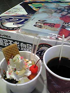 冷凍庫の中のアイスクリーム、冷蔵庫の中の様々なフルーツの缶詰、生クリーム、ナタデココ、白玉、餡、それにチョコやキャラメルや苺のシロップ等を自由にカップに盛りつけて食べられるのです。飲み物もいただきました。