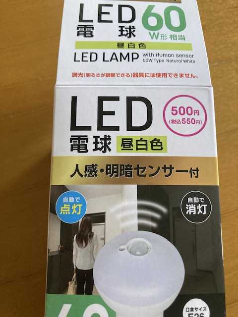 突然壁のスイッチが🔛のまま戻らなくなった💡幸いなければないで何とかなるのでとりあえずLED電球を外し暗いまま放置🙁わざわざ修理業者さんを頼み電気工事するのもなーっと多少の不自由はあるがひと月あまり我慢していた。先日ある動画を見てもしかしてDAISOのコレでいけるかも💡早速購入 くるくる💡付けたら🙆昼白色で電球色でないのが残念だけど全く問題なく反応💡これで550円なんて🙌40W相当だとDAISO以外でもお手頃なのかな?楽天さんではこんなのありましたLED電球 LDA8L-G/KU/NS パナソニック 口金直径26mm 電球60W形相当 電球色 一般電球・人感センサー(LDA8LGKUNS)【2個セット】電球 LED E26 40W 人感センサー おしゃれ アイリスオーヤマ LED電球 40形相当 明暗センサー 人感 ライト 広配光 昼白色 昼光色 電球色 E26口金 照明 照明器具 天井照明 廊下 トイレ LDR6N-H-SE25 LDR6L-H-SE25 防犯