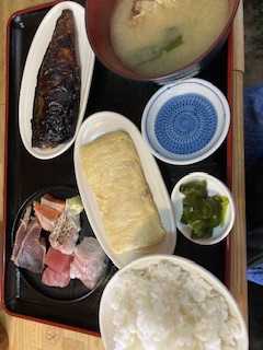 今日1日分の魚クリア🙆ランチ鯖味噌漬焼でご飯が進む。鯛中骨だしのお味噌汁おいしい刺身盛りとだし巻き卵どれがメインだかわからないボリューム☺️味噌漬けは焼くと表面焦げるよね🤭ペロっと皮が剥がれるので特に問題なし。