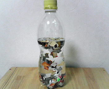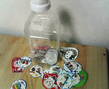 なんとなく作って、その割には好評なおもちゃ。おむつやお菓子の袋の絵を切り取って、なんとなくペットボトルに入れて渡したら、自分で一生懸命出したり入れたりしています。まあ、最後には出しっぱなしで終わるので、母が床に散らばったのを1枚1枚拾って、ペットボトルに戻すんですけど。ビニールなので、物を口に入れなくなってからがいいと思います。Taro 1歳10カ月のときに作りました。