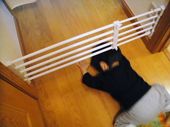 友達が突っ張り棚をベビーゲートにして使っているのを見て、家でも真似していましたが・・・先日ついに、通過できようになりました。(Taro、1歳8か月のときです)後ろ向きになってお尻を潜らせ、最後に頭を抜きます。これで、どこまでも母を追いかけられますベビーゲートって、使用期間が短いのに高いですよね。突っ張り棚のベビーゲートならずっと安いし、使用後は本来の役目に戻ることができます成長段階にあわせて高さを調節できるし、横幅も自由自在。赤ちゃんがつかまり立ちしても大丈夫です。(耐荷重にもよると思うけど)ただし、階段の上とか下に設置するのは、危険我が家では私も Kさん も、数回つまづいています。Taro も、背が伸びて突っ張り棚の位置が低くなった時に、頭から落下しました。