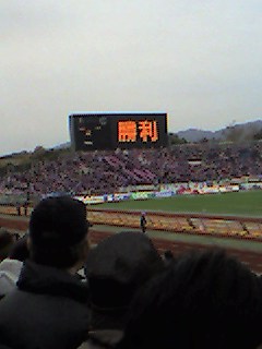 タダ券を兄ぃから貰って見に行きましたが…寒いとは聞いてましたがめっちゃ寒い(泣)キックオフ前↓ ハーフタイムの前に普段は飲まないコーヒー(カフェオレでしたが)を飲んでしのぎましたよ。結果は兄ぃの応援も虚しくサンガ降格決定兄ぃにメールで桜○や○くん風に「サンガが負けてがっかりだよ!!」と送ったら「うるさい!!」と返ってきました(笑)久しぶりのサッカー観戦。と言うより今年の3月以来(笑)開幕直後に閉幕直前今度こそ中間も見に行かなくちゃ(汗)24日追記。サンガ降格決定…と書いたもののまだ決定ではなかったんです(汗)セレッソが引き分けた為入れ替え戦になる可能性もありました。