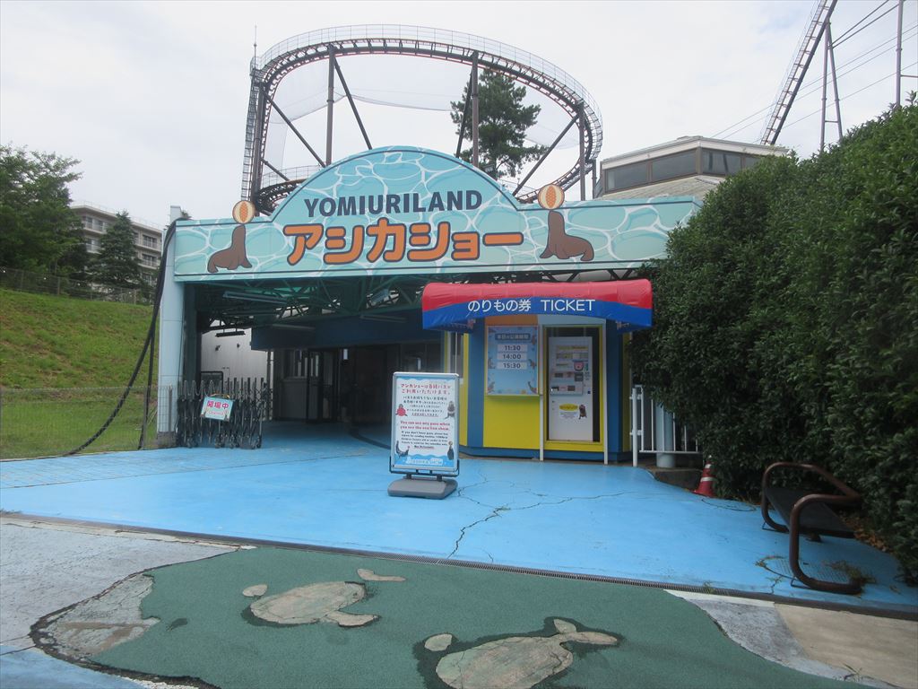 お土産を購入後開催時間を告げる放送が鳴り響いていたので向かった先は そう「アシカショー」会場で、あります。 まずは券売機で 入場券を購入 「よみうりランド」で購入した唯一の「のりもの券」¥300円 会場は こんな感じにお客さんは俺を含めて女子高生二人組、赤ちゃんとお母さん、小学生2人とその父母、総勢9名 超~閑散とした・・・会場(^^; まずは ラムネちゃん登場! まずはお得意の ゴロンゴロン お次は お兄さんの股抜け歩き そして最後に 倒立をして 直立をして・・・さようなら お次は お姉さんとライム君 やはり お姉さんの股抜け歩きをし 輪っかを拾って 水中に潜って ジャンプしてボールをヘッド そして真打寛太君が登場し お兄さんから輪っかを預かり 五人が其々の場所から輪っかを投げると寛太君が全てキャッチ すると・・・寛太君の首には五つの輪っか 最後に 「手をたたこう」を皆で合唱 時間にして20分少々 いい経験をしちゃいました では、では