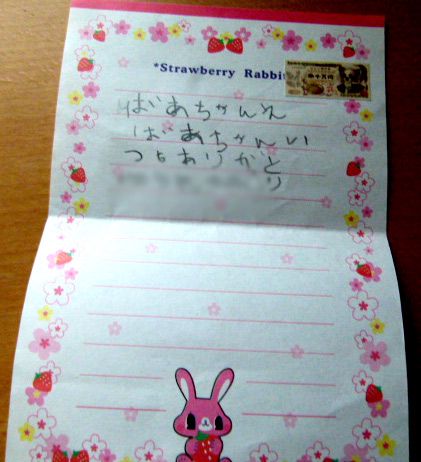 雨なので家で過ごしました。家の中の整理をしようと・・片付けた後、気になる事がひとつ水漏れの損害の請求書をまだ完成していないこと。「今日こそ仕上げよう!」とやっと書き上げた。ガスコンロ、コンロと壁の隙間シェルフ&受け皿キッチン周り一式、そして洗濯機周り一式。一緒に送る書類を全部用意できたので封筒に入れあとは投函だけ。そのあと、バッグの中を整理してたら出てきたもの。大分前に姫がお気に入りの便箋にばぁばの目の前で書いてくれた”お手紙”。なぜか?まだブログに載せてなかった!。なので突然ですが・・今日、紹介することにします。(今日は書く事がなくて)右上になぜか?お金のシールが貼ってあります。ばあちゃんえばあちゃんいつもありがとう○○○○○○り(名前の最後のりだけ残しておきました)縦が10数センチほどの小さな便箋に小さな字が書けたのです。ばば馬鹿ですみません!・・・・・・・・今日は早起きしました。5時45分に目が覚めてしまった。良いお天気のようで、梅雨の晴れ間。まず洗濯から・・。★被災者が選んだ震災グッズをまとめています・・・・・・・お薦め雑貨&インテリアグッズ