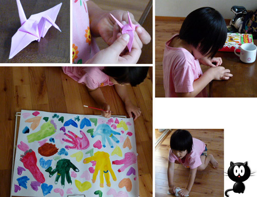昨日は午前中、姫がやってきました。姫が言うには、「今日はばーちゃんちに行きたい」と言ったとか。昨日は「おじさんちの夕食に招かれてるから、行く時寄るから夕方まで預かって!」ということでした。来た早々「ばーちゃん、ここ掃除した?拭いた?雑巾ある?」と姫が聞きます。雑巾を渡すと、拭き掃除が始まりました。そのあとは、粘着テープのコロコロの掃除機で寝室のカーペットやベッドを掃除。雑巾がけはいつも家でもやってるそうです。お昼を食べ、デザートのアイスもペロリ後はいつものお絵描き、水彩絵の具をさっさと出します。筆やパレットも出して、最後に隠れミッキーを入れる細い筆も出しました。昨日は何を書こう。。ということで、手の平のパーを画用紙にあて、輪郭をとって次はチョキの手。足も画用紙に乗せ型を取りました。あとは好きな色を塗るだけです。黄色いばぁばの手の指に結婚指輪が入りました。隙間にはいつもハートはお花を描いて・・最後に小さいミッキーマウスを(隠れミッキー)を書きこんでおしまいです。そのあとかるたや折り紙をしました。折り紙は普通の折り紙の4分の1の小さなサイズで折鶴を折りました。そうそう、お作法も披露してくれました。立っている姿勢から、右足をわずかに後に下げて腰を下げ、一旦、起座の姿勢からお尻を落として座ります。お辞儀は、膝に置いた手を両膝の外に回しながら前に持ってきて両手で三角を描く角度に合わせ、頭を下げていきます。きれいなお辞儀ができていて、ばぁばびっくりしました。午後はお風呂に少し温めの水を張り、そこで遊ばせました。ばぁばは、そばで見て居ました。はぁ!と目いっぱい息を吸い水中にもぐります。水中で目を開けられるそうで、ちょっと前プールに行った時、水の中でお父さんの足を見たそうで「細かった」って。夕方、ひまわり家族みんな揃って迎えに来て、車から手を出してタッチして・・帰っていきました。馬吉も顔出してタッチ見えなくなる車の窓にバイバイの手が2つ見えていました。。。。。。。。。今朝は曇り、朝は程よい気温です。★被災者が選んだ震災グッズをまとめています・・・・・・・お薦め雑貨&インテリアグッズ