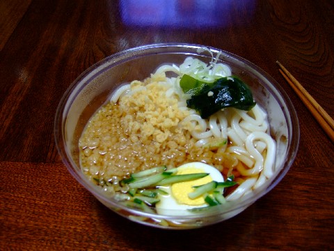 今週末にはどっかに旅行に行くことになってるのですが、その前に私のうどん熱がヒートアップ中。会社の近くにしこしこの美味しいうどん屋さんがあって、そこのうどんセットはざるうどんにきんぴら、よく染込んだ煮物によく漬かってるちょっと古漬けのぬかづけ。ほっかほかご飯でえーい800円!てのがあって、これがまた美味しいもんだから休み中も中毒のように「食べたいなぁ・・・食いに行こうかなぁ・・・」と考えてまして。でも休みの時まで仕事場に近づきたくないんですよね。で、セブンイレブンで見つけた「冷やしたぬきうどん」を毎日のように買って食べてます。たぬきうどんは好物です。テンカスサイコーです。なので、ちょっとカリカリのうちに具を全入れですするこのうどん、結構美味しくって。ちょっと汁がしょっぱいのがなんですが、暑い日にはつるつるっと美味しいです。実は、コンビニうどんはあまり食べたくなかったんですよ。私数日間ほどモバイトでコンビニ用うどん、そばの製造工場で働いてまして、その時のシゴキを思い出しちゃって。こっわいオバチャンが上司抜いてすごい存在になってまして。何で私的になるんだろうなぁ・・・。「あんた昨日も来てたじゃないのよ!何で出来ないの!」と怒鳴られた時は「げっ、覚えてやがった!!」とびっくりでした。鼻と目しか表に晒さない仕事着を着ててなんで見分けられるんだ・・・。6時間休み無し立ちッぱで延々コンベアを流れてくる麺を見てたら食いたくなくなってくるんですよ。なので今回冷やしたぬきなんて食べたの初めてです。結構いけるじゃん。でも本当に行きたいなぁ、うどん屋さん。