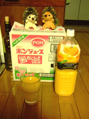 オレンジジュース(100%のもの)が大好きです。この日もオレンジジュースが飲みたいなぁ、と考えながら買い物をしていると、2リットルのペットボトル入りのでか物が!!喜び勇んで買って帰るとですね。家にこんなものがあったらあなたはどうしますか?ポンジュース6本。箱入り。好きだけどさ、好きだけど、何もこの日にくれる事無いじゃんHONDAさん。。。。。車を車検に出したお礼に持ってきたそうです。これから飲み放題さ!!やったね!!(泣)(ジュースはうちでは私しか飲みません)