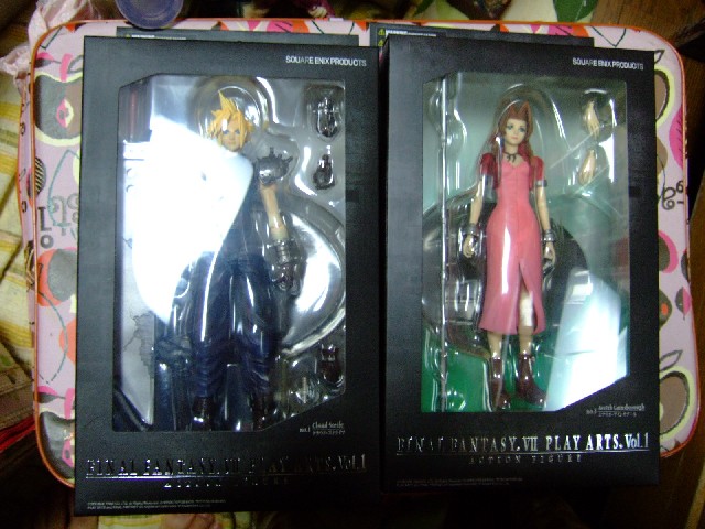 かなり前から予約してたんですが、今月到着しました。どこまでもFF7ファンにはたまらない商品です。確かFF7発売当時も同じのがでたのですが、かなり出来がむにゅむにゅだったのですが、今回は気合入ってます!かなり良い出来です!!クラウドの商品っていえば買える範囲でゲットしてます。ACのポスターも持ってるよ!エアガイツのクラウドのイラストだけのためにファミ通買って、切り取ってカラーコピーしたものを部屋に貼ってるよ!気持ち悪いくらいファンだよ!!10年前に好きだった人が居たんですが、友人から「金髪にして髪立ててもらいなよ」「そうしたら最高じゃん」とか言われたことあるよ!!なので、かなりこのレベルなら嬉しい!武器や付属品とか洋服も細かくて、これで2700円(私が買ったとこの値段)ならOK!クラウドは足の付け根のとこが稼動できるので座らせることが出来そうなんですが、エアリスはやっぱ無理みたい。目が空ろなとこが気になるのですが、後は全然大丈夫。全体的に当初のイラストよりも大人びてます。この2人はコールドキャストも持ってるの程好きです。(クラウドは3回払いで買いました)(エアリスのためにオークションID取りました)