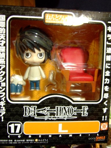 もうずいぶん前に買っていたんですが、やっと今日開けました。「デスノート ねんどろいど L」です。これ、顔を変える事が出来るフィギュアなんですよ。色々な漫画やアニメなどのキャラが発売されてます。頭の方が大きいので重量感ありまして、安定感ないです。(ちゃんと台座はあるのですが)デフォルメなのですが、とりあえず基本顔以外は絶対Lはこんな顔しない。というのが多かった。ライト、ミサ、リュークもあるのですが、ライトのにやり顔、変な違和感が。基本体制。これは普通ですね。ここからおかしくなってるんですが。Lにはイスが付属しております。あと携帯持った手もあって、変える事が出来ます。ちゃんと猫背風なのもぐー。でもこんな顔しない。あ、アニメで1回見たな、この顔。私はこの顔が気に入って購入したようなもんです。まゆげがないので余計可愛い気がする。今はこの顔で飾っています。向きを変えて。かなり気に入ってます。あとびっくり顔があるのですが、なんか死に際のあれみたいであんまり。。。。ホント顔が重いので、イスに座らせてもちょっと動かすと倒れるのがたまに傷。私はamazonで購入しました。今バカみたいなお値段でamazonで販売されてますが、4月に再販あるみたいですので他の店ではお安く予約してますよ。amazonおかしいでしょ、今でもあの値段って。5000円ですよ?5000えん。