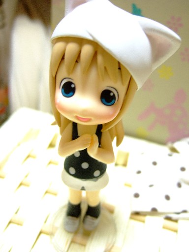 違うバージョンが販売されてるのは知ってたんですが、同じようなものなので買いませんでした。が。この前中古おもちゃ屋さんで展示されてるのを見たら色違いがあって可愛かったので、ついつい購入。買ったのはこの子。メガネっ子を持ってなかったので買おうか迷ったんですが、好みではないのでやめました。相変わらず名前知りません。この子だけ3人目ですよ。セピア調で良いんだけど、服と色が違うだけだった。帽子が可愛いです。秋葉で買ったときはJJさんに「買いすぎ!」と言われるほど一気に買ったんだった。だって可愛いんだもん。名前知らないけど。アニメは1回だけ見ただけだけど。漫画なのかゲームなのか元ネタ知らんけど。髪の毛のパーツを無くしてしまった子もいるの。黒髪の子の片方がショートヘアみたいになっちゃってる。今はキャビネットに並んでます。萌えフィギュアって結構好きです。