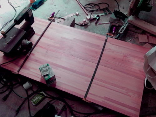 また連休です。さっさと進めましょう!前回の休みに 接着しておいた天板を早速確認します。クランプのせいで そりが若干ありますが・・・・何とかなりそうなレベルですね。横幅は 板の幅いっぱい使いますんで整えるために少しだけカットしました。奥行きは70センチでカット・・・・・しなかった。計ったら 72センチだったんで(^^;)では この板を補強すべく両端に1×4の半割り材を固定します。固定するときに そりを修正しながら固定したんで天板はフラットになりました(^o^)真ん中当たりにも補強を入れるかと思ってましたが両端に入れるだけでかなりの強度が出たんで 止めました。そして 240番でサンダーをかけてウレタンクリアーで 簡単に塗装。このまましばらく放置します。表面乾燥まで1時間です。にほんブログ村 家族ブログにほんブログ村 家庭・家族にほんブログ村 ハンドメイドブログにほんブログ村 木工にほんブログ村 車 修理・整備にほんブログ村 自作PCにほんブログ村