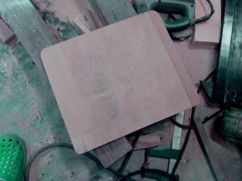 さてモニターのアダプターを作らないと・・・時間は無いぞ~~~~早速板をカットします。適当なコンパネに 前のモニターを載せて型を取りました。あとはカットするだけ。あっという間でした。角はジグソーで丸く。そして 45度ビットを使ってぐるりと加工します。綺麗にできた~~~~~なんかいい感じです。さて配線を通さないといけないので穴を開けます。とりあえず19ミリのキリで穴を開けます。ここで モニターを外してきて実際に配線を通してみると・・・・・通らない(>_