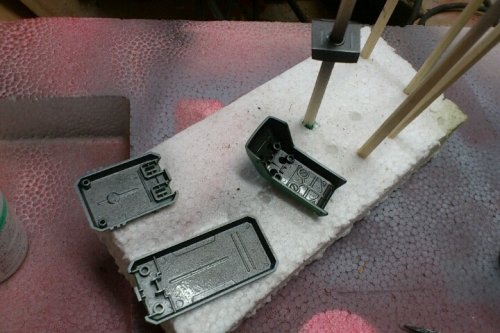 久々の ガンプラですがとりあえず グリーンが買えたんで塗装してみます。もちろん純正カラーは使わないので 色を考えないといけません。で今回は カーキ メタリックグリーンを使ってみます。カーキで暗めを調整して ハイライトにメタリックグリーンを塗ってみるつもり。とりあえず 盾でテスト。カスタムしたんでサフを塗ります。これでよし。意外と削り傷も消えてくれました。これなら仕上げ磨き入らないかな?そして 塗装です。カーキを適量取り メタリックグリーンを混ぜると・・・・?なんか変だな?こんなもんだったか?とりあえず塗ってみよう。シュ~~~~~~~~げえええええええええええ粉を拭いてるよ!これは 油性塗料を水で溶いたときに出るやつだ!(経験あり)なんで?確認します。なんと メタリックグリーンが油性です・・・・実は 以前買ったやつだったんですがあることを忘れて今回再度買ってきたんですが古いほうから使おうと出してきたものでした(-_-;)今回買ってきたやつが 水性で間違いないので洗浄して再度仕切りなおし。そして塗装です。いい感じです(*^。^*)ただのメタリックだと 超合金みたいになるかもと思いカーキを混ぜましたが軍用色で使うんで合いますね(^_-)-☆これが乾燥したら メタリック塗ってみます。にほんブログ村 家族ブログにほんブログ村 家庭・家族にほんブログ村 ハンドメイドブログにほんブログ村 木工にほんブログ村 車 修理・整備にほんブログ村 自作PCにほんブログ村
