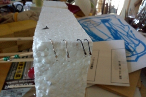 最近 ルアーでも最終兵器として塩イソメを使ったりしてます。そんなときに針がなかったりする(~_~;)そう最近 ジグヘッドを多用しているため冠つき針を持っていないのです(~_~;)買いに行くのも面倒なんで作ってみることにします。今後の大量生産を考慮して簡単に・・・・結局 ダイソーのステンレス針金を針に巻いて冠を作り 瞬着で固定。わかりますかね?キス針7号とチヌ針1号を2個ずつ。私はキス針が大好き。餌釣り、ルアーと 使用範囲が広く使い勝手がいい。夜中にルアーやってて 「釣れね~~~~~」ってときにイソメ使って 坊主回避じゃ~~~~と即移行できる(~_~;)っていうか腕上げろよ!にほんブログ村 家族ブログにほんブログ村 家庭・家族にほんブログ村 ハンドメイドブログにほんブログ村 木工にほんブログ村 車 修理・整備にほんブログ村 自作PCにほんブログ村