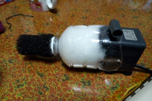 朝起きるとすぐに状態を確認しました。やべ~~~~~~バケツから水が溢れそうでした(~_~;)どうやら濾過はできたようですが詰まってくると 水が溢れる。これはどうしたらいいんだろう・・・・・そこで ネットでネタを検索。またいろんなことがわかりました(^^)物理濾過装置で 問題になるのはポンプのメンテ周期。実は 排出側で濾過することにこだわる必要がない。吸い込み側で濾過すればいいのです。目からうろことはこのこと!実際 吸い込み側で濾過するとポンプのメンテもずっと楽になるそう。そこで簡単に作れるもので製作。ペットボトルをカットして リオにはまるようにしました。500ミリリットルだと丁度でした。濾材はなんていうんだっけ?ダイソーで買ってきたウールの濾材です。4分の1くらい入れました。吸い込み口には 上部濾過装置のスポンジをつけてみました。全てはめ込み式。固定はしていません。水中ポンプは 吸い込み量がすごいので濾材が詰まっても 違う場所から吸い込もうとするらしく濾材が限界まで使えるようです。入れてみました。見えないくらい濁ってます(~_~;)かなり小さいですが これでテストします。とにかく 小型で 水漏れのトラブルは皆無。これはいいですね~~~~~~~現状これから夜勤なんでどうなるかが楽しみです(^^)にほんブログ村 家族ブログにほんブログ村 家庭・家族にほんブログ村 ハンドメイドブログにほんブログ村 木工にほんブログ村 車 修理・整備にほんブログ村 自作PCにほんブログ村