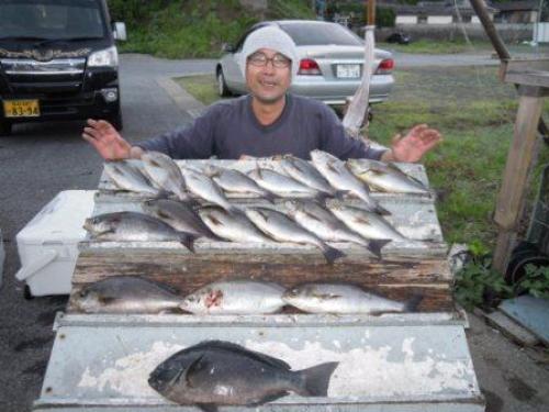 さて15メートルくらいある 防波堤の上から釣り開始。水汲みバケツも届かないので魚も釣れたらぶっこぬきしかないです。投げタモもありますが 夜間は面倒なだけと判断。とりあえず釣り始めたら いきなり一投目でM君にイサキがヒット。みんなのテンションも上がりましたがその後は釣れず。H君はカゴを持ってこなかったそうでフカセで頑張っていますが・・・・私は遠投カゴにチェンジして ハリスも3.5号に変更して開始。釣れないうちにあたりも暗くなり潮が逆に変わると・・・・・爆発しました!一投ごとに釣れる!完全にウキが消えるまで待って合わせてちょうど口にかかる感じ。引っ張りあげないといけないので 飲ませたほうが確実なんで。上がってくるのは30センチクラスのイサキ。これでも嬉しい。しかし とても重労働なんで疲れます(ーー;)でも自作のカゴで釣れるんで楽しいです(^.^)しかし 長くは続かず。カゴを大きめにしたり 棚を細かく変更したりいろいろやって釣果を伸ばしていきました。朝は5時に回収なんで あっという間でした。もう少し釣りたかったな~~~しかし私はやばい状態に。手が震える。グーにできなくなってきた。こりゃ 脱水症状です(~_~;)水分は取ってたんですが 塩分が足りなかったようです。あ夜中の寒さを懸念して 冬の防寒を着てたせいかも。とりあえず何とか陸に戻りました(^_^;)今回の釣果。自分では手も動かないので(顔も引きつっている)ゑびす丸さんのブログから拝借。クロはH君の。終了1時間前に何とか釣り上げた本命です。疲れた~~~~~~帰りに即効で自販機でスポーツドリンクを購入。M君家に着く頃にはなんとか動けるようにはなりました。やばかった~~~~さて自宅に着いたのは朝の8時。この時間に帰れると 助かります。早速 嫁さんに見せるともう結構減っていた(~_~;)実家にもあげたんで。でも喜んでました。早速料理だね。にほんブログ村 家族ブログにほんブログ村 家庭・家族にほんブログ村 ハンドメイドブログにほんブログ村 木工にほんブログ村 車 修理・整備にほんブログ村 自作PCにほんブログ村