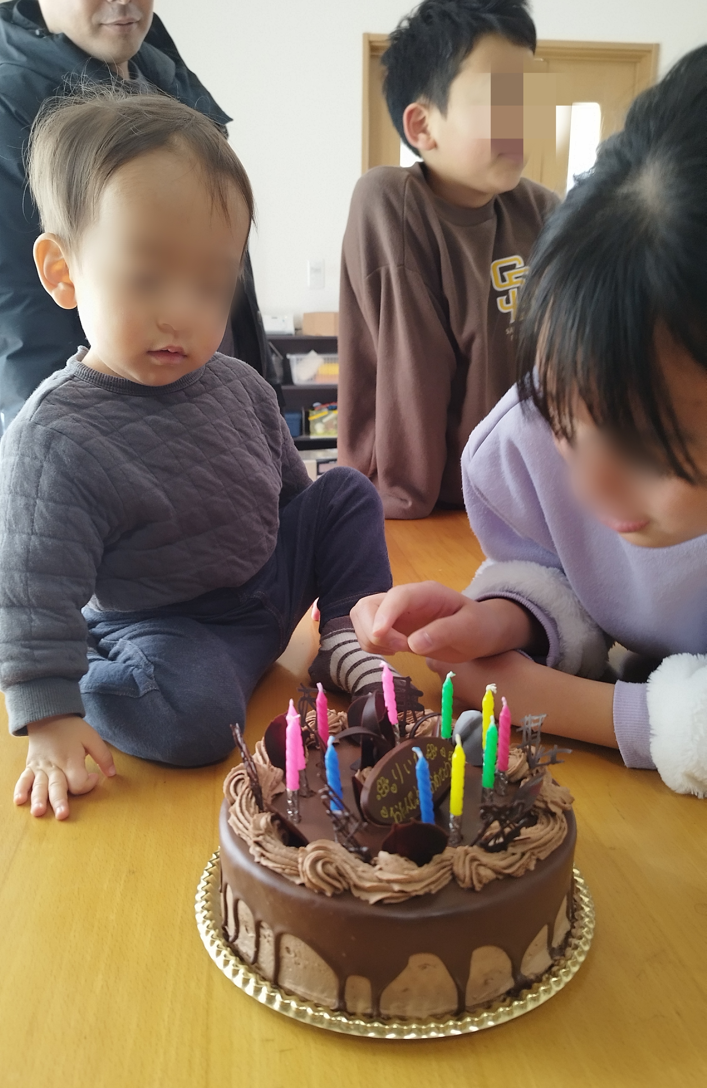1月は、孫長女、息子、夫の誕生月。まとめての誕生会を日曜日にしました。ケーキとご飯を食べるだけなんですけどね。誕生日を理由に我が家に呼んで、家族の交流を深める目的。息子一家はお嫁さんの家の離れで生活しています。車で30分程かかり、忙しさにかまけてなかなか会えません。いつか我が家で暮らすかもしれませんが、義母の介護もエンドレスで続きそうですし、子供たちの学校のこともあり同居は難しそう。お嫁さんも、実の両親の支援を受けられるので、そっちのほうが子育てしやすいかなと思います。孫の子育てに参加できないのはさみしい気持ちもしますが。ケーキにロウソクを立てます。チビちゃんはテーブルの上に座ってます。イチゴをほうばるチビちゃん。