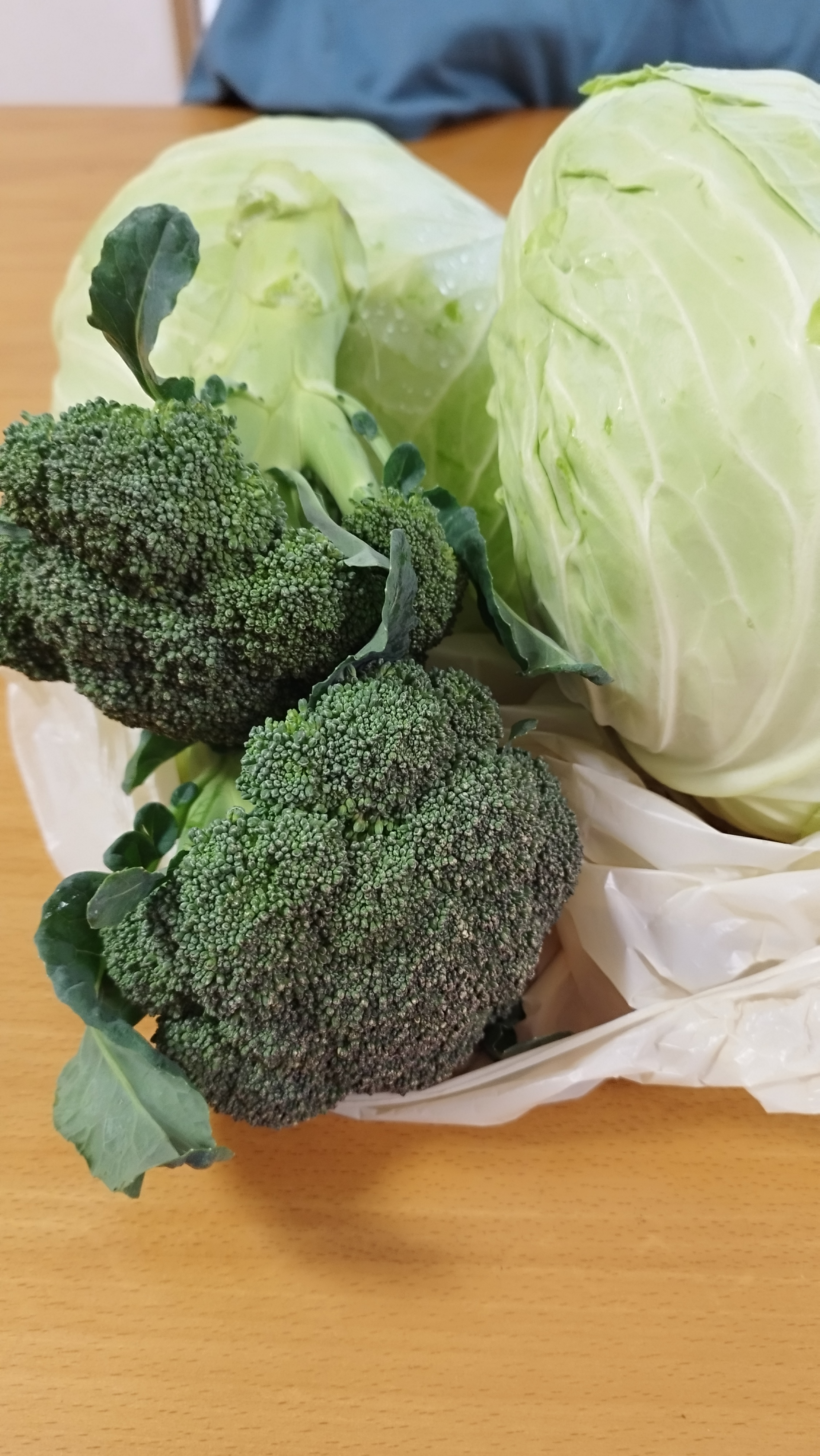 野菜の高騰すごいですね。物価全般の値上がりがある上に、不作。我が家も昨年は素人でもこんなに野菜ができるのだと、ウハウハでした。白菜、大根、ブロッコリー、カリフラワー、キャベツ。今年も同じように植えたのですが、ほぼ全滅。枯れもせず成長もせず。わが家だけでなく近所もそんな感じ。原因は色々あるでしょうが、どうしようもありません。 お正月からお腹の調子が悪く、夫も同じくで炊事の意欲なし。野菜も食べたくなくて年末からの野菜が残っていましたが、そろそろなくなりました。まあ、大根はお正月の間にも成長したかと出かけると、ご近所さんからキャベツとブロッコリーを頂きました。近所には専業農家で冬野菜を作っている方が結構いらっしゃる。ほぼ養ってもらってます。助かりました♥️。我が家の大根も食べるに困らないサイズのものがありました。