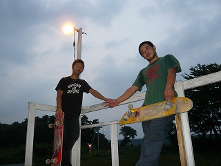 一日がスケートで終わる、なんて贅沢なんだー★今日は昨日に続き、秘密基地にて練習!すぽーてぃーにじょいんとのスケートブログでおなじみ!モヨコさんも来てヒートアップ★↓髪の毛切ったらカッコよくなっていた★ブヒヒ!だれかのゲップの匂いに怒りを感じたこの方は★小学校から知り合いのヨウちゃん☆↓べアリングがゲップの匂いにより故障してしまいました・・・。が、しかし!↓このノーズグラインドを見れば彼はゲップを味方にしたことでしょう★(ちなにみ、ゲップは俺じゃないよ)そして、時間が過ぎさらにヒートアップ☆すると、一般の紳士の方が「君たちの挨拶がとても気持ちよかった!!ジュース飲んでがんばって」っと、エールを頂きました☆本当にありがとうございます!いい人もいるもんだぁ↓んで、ジュース☆↓・・・がしかし、本数が人数より多い・・・・すると二人の若手の間で乱闘勃発!↓そのとき、トニー・アキバの天の声が、「二人とも、やめろろろろ!」「お見苦しいところをお見せしてすみませんでした。ごめんなさい」その後、タカチャンとオチアイくんがバックテール対決でジュース獲得を決めることに!まずは、オチアイくん↓何度かメイクしそうな時が☆惜しいものの、なかなか決まらない!そして、タカチャンの番↓ アッキー 「今のは、どうですか!チェリォ委員長!?」↓ チェリォさん 「うむむむ・・・腹が・・痛い。へっ?何? あっ! この勝負、互角だがタカチャンの勝利ジャーーー!」 そして、暖かい声援の中、タカチャン授与式↓タカチャン「ぐへへへへへへ。いただきだ。」 眠いので完